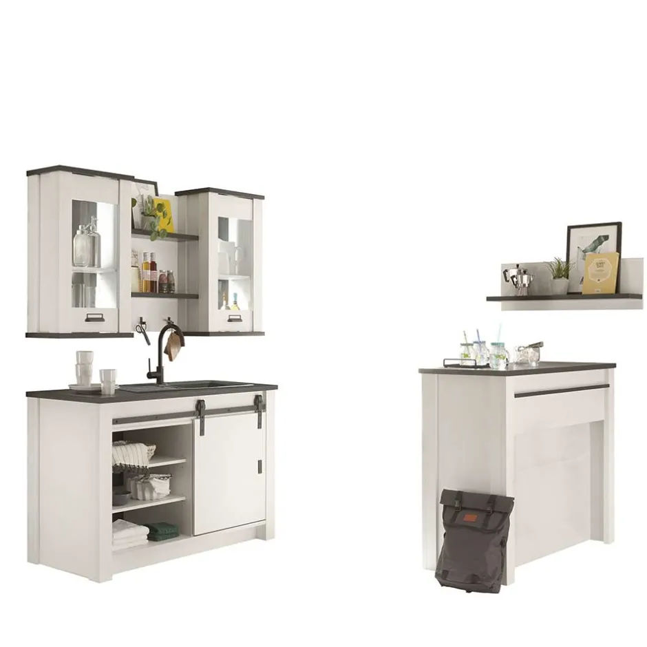 Die Sechsteilige Kombination umfasst alle wesentlichen Elemente, die Ihre Küche komplettieren: Ein Hängeregal und zwei Hängeschränke bieten ausreichend Stauraum für Geschirr und Gläser, während eine geräumige Theke Platz zum Kochen und Genießen bietet. Ergänzt wird das Ensemble durch einen Unterschrank und ein Wandboard, die Ihre Kochutensilien stilvoll präsentieren.