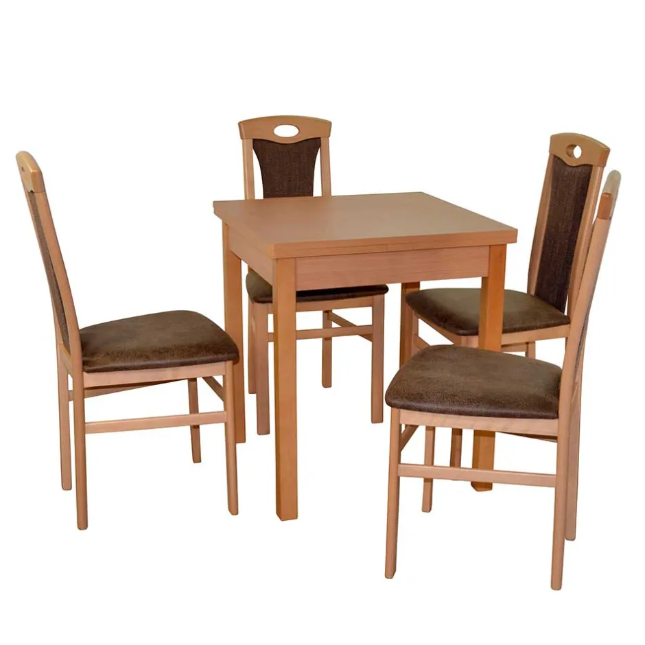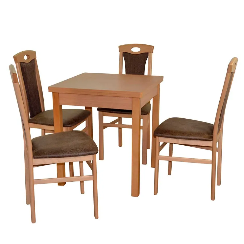 Vier geschmackvoll designte Stühle und ein hochwertiger Tisch bilden die harmonische Komposition dieser stilvollen Sitzgruppe. In warmen Buchefarben und eleganten Brauntönen gestaltet, bringt „Uminia“ eine Atmosphäre von Behaglichkeit und kultiviertem Wohnstil in jedes Zuhause. Der perfekte Treffpunkt für gute Gespräche, genussvolle Mahlzeiten und gemeinsame Momente.