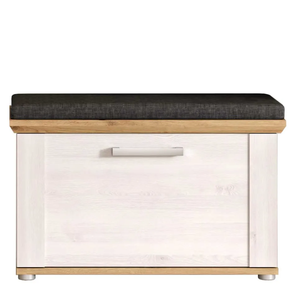 Die Bank (Maße: 80 x 47 x 39 cm) punktet mit Stauraum und Sitzfläche in einem. Hinter der Klappe verbergen sich zwei verstellbare Einlegeböden und eine Mittelwand – ideal für bis zu vier Paar Schuhe (je nach Größe). Die Sitzhöhe beträgt ohne Kissen 47 cm, mit Polsterauflage ca. 52 cm. Ein silberfarbener Kunststoffgriff ziert die Front, Bodengleiter sorgen für stabilen Stand. Die maximale Belastbarkeit liegt bei 90 kg, die Einlegeböden tragen jeweils bis zu 5 kg.