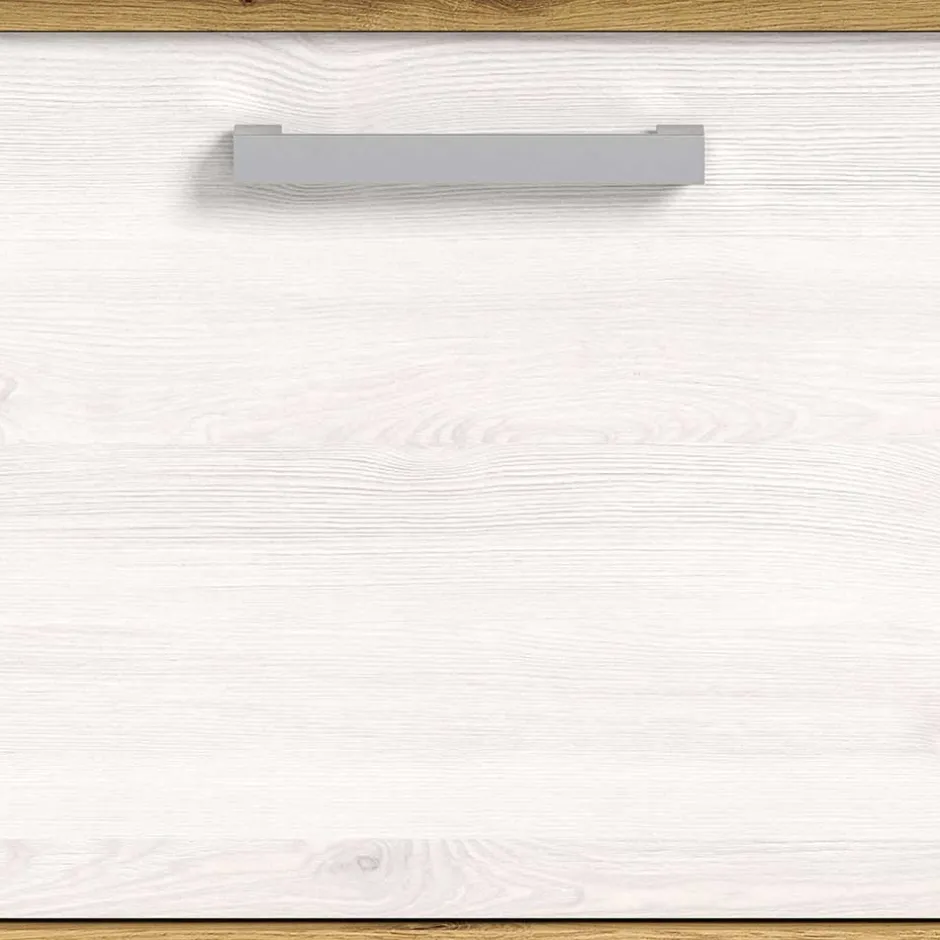 Gefertigt aus robuster Spanplatte, sind alle Elemente melaminbeschichtet und damit pflegeleicht. Die Fronten in weißer Lärche Holzoptik, kombiniert mit Deckplatten und Böden in Wildeiche-Nachbildung, werden durch silberfarbene Kunststoff-Bügelgriffe sowie Kassettenoptik stilvoll ergänzt. Für die nötige Sicherheit sorgt eine Kippsicherung zur Wandmontage – im Lieferumfang enthalten.