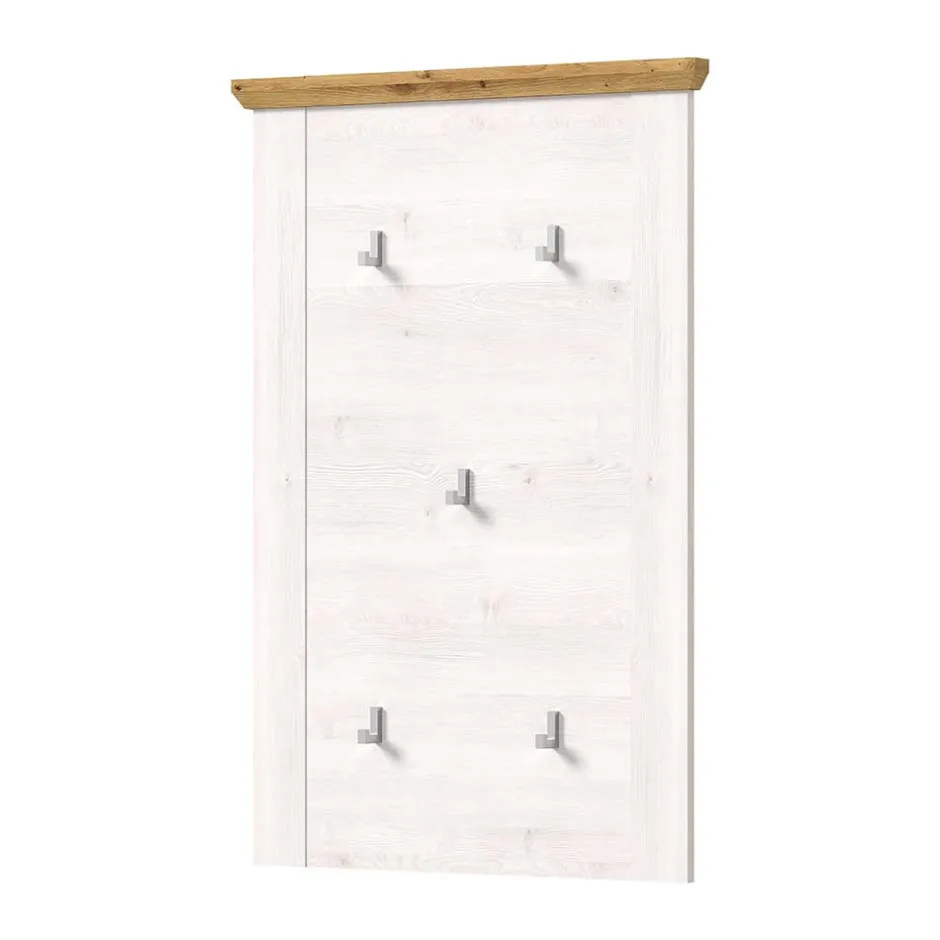 Die passende Garderobe zur Wandmontage (Maße: 68 x 103 x 6 cm) verfügt über eine durchgehende Rückwand sowie fünf fest montierte Kleiderhaken aus Metall. Jacken, Taschen und Accessoires finden hier griffbereit ihren Platz – formschön und funktional zugleich.