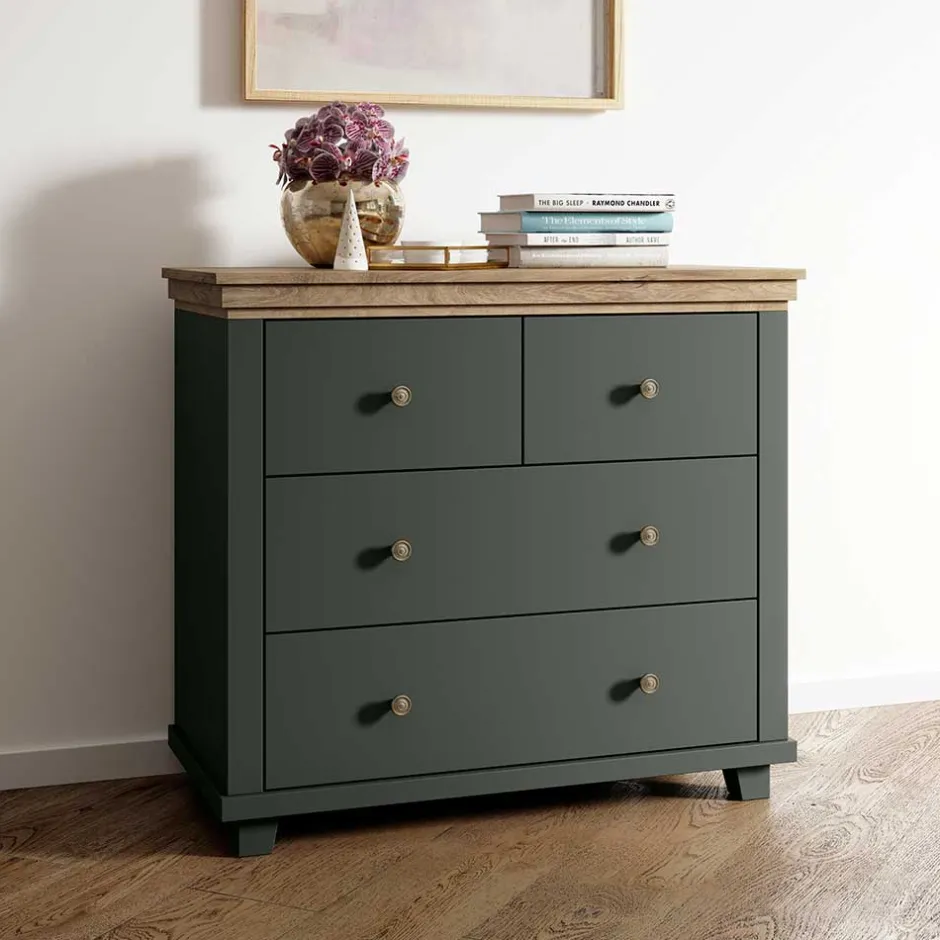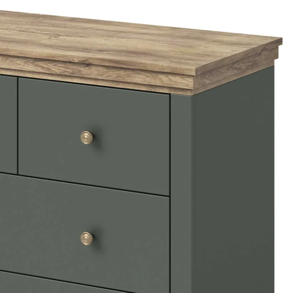 Gefertigt aus robuster, hochwertiger Spanplatte präsentiert sich die Kommode als langlebiger Begleiter für den Alltag. Die solide Konstruktion sorgt für Stabilität und eine angenehme Haptik, die Qualität spürbar macht. Matte, dunkelgrün beschichtete Oberflächen verleihen dem Möbelstück eine elegante Tiefe, die Ruhe und Natürlichkeit ausstrahlt. Das Finish fühlt sich samtig und angenehm an – eine Oberfläche, die zum Darüberstreichen einlädt und zugleich pflegeleicht sowie widerstandsfähig gegenüber Kratzern und Feuchtigkeit ist.