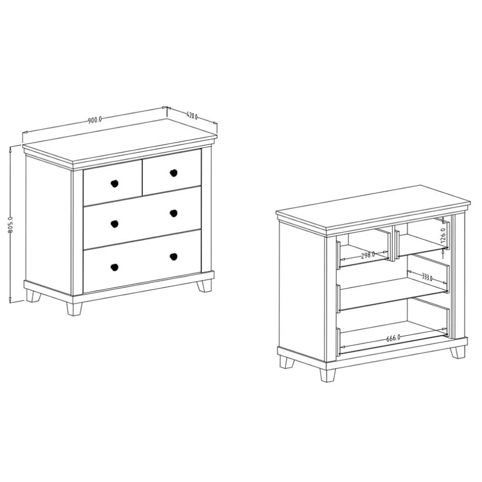 Mit einer Breite von 90 cm, einer Höhe von 81 cm und einer Tiefe von 42 cm bietet die Kommode reichlich Platz für Kleidung, Wäsche, Geschirr oder Alltagsutensilien. Vier Schubladen gleiten dank hochwertiger Metallauszüge sanft und leise. Die Soft-Close-Funktion schließt jede Schublade wie von selbst – sanft, sicher und nahezu geräuschlos. Dank Vollauszug behalten Sie stets den Überblick über den gesamten Inhalt, ohne mühsames Suchen in der Tiefe. Runde Metallknopfgriffe ergänzen das Design mit einem dezenten, klassischen Akzent und liegen angenehm in der Hand.