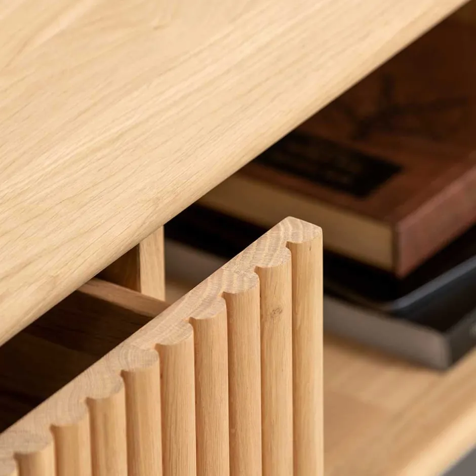 - Oberflächen geschliffen und weiß geölt, Fronten mit tiefer Rillenstruktur gestaltet