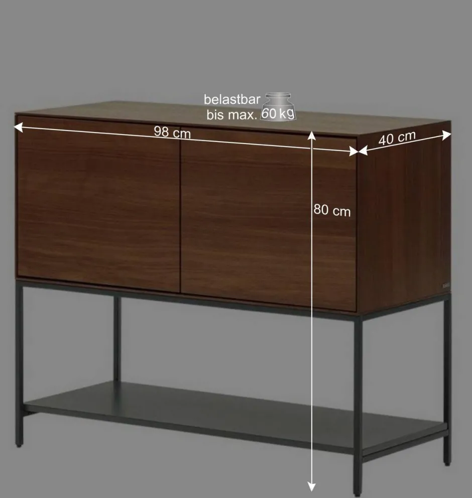 Mit ihren großzügigen Abmessungen von 98 cm Breite, 80 cm Höhe und 40 cm Tiefe bietet die Kommode „Milena“ reichlich Stauraum für all deine Bedürfnisse. Die beiden Türen sind mit hochwertigen Soft Close Metallbeschlägen ausgestattet, die ein sanftes und geräuschloses Schließen ermöglichen und so den Komfort im Alltag erhöhen. Im Inneren befinden sich zwei verstellbare Einlegeböden, die sich flexibel an deine Bedürfnisse anpassen lassen und jeweils bis zu 5 kg belastbar sind. Diese Böden bieten ausreichend Platz für Bücher, Geschirr oder andere Gegenstände, die du ordentlich und griffbereit aufbewahren möchtest. Eine zusätzliche Ablagefläche unten bietet Raum für dekorative Elemente, die deinem Zuhause eine persönliche Note verleihen. Die Deckplatte der Kommode ist besonders robust und kann mit bis zu 60 kg belastet werden, sodass sie auch für schwere Gegenstände wie Vasen oder Skulpturen geeignet ist.