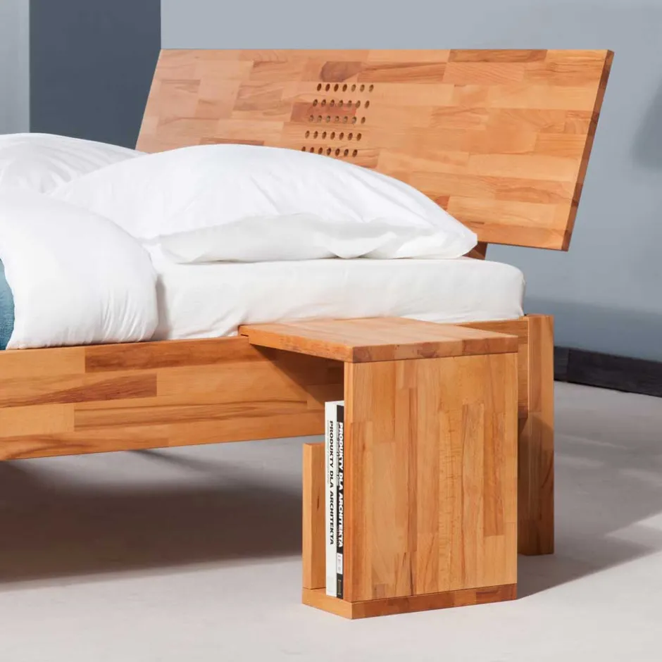 Optional erhältlich sind zwei passende Nachtkommoden aus massiver Kernbuche, die mit ihrem offenen Fach idealen Stauraum für Bücher oder andere Nachtutensilien bieten. Die Kommoden fügen sich nahtlos in das Gesamtbild ein und erhöhen die Funktionalität Ihres Schlafraums.