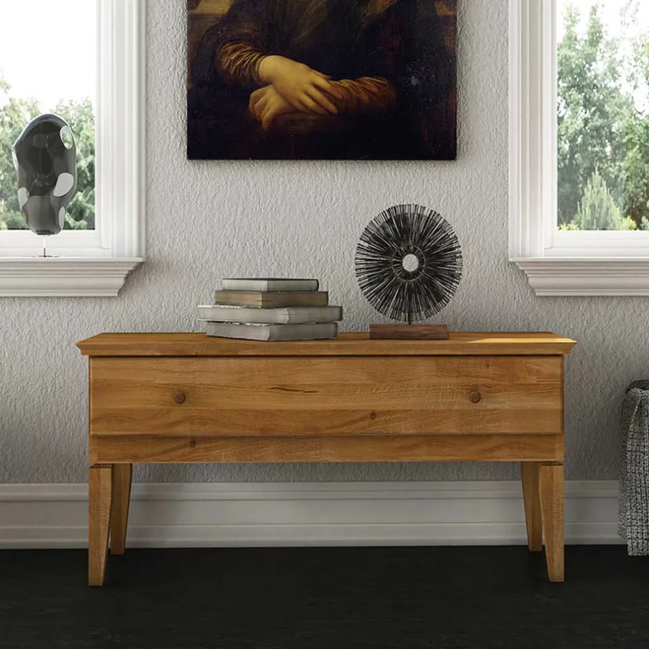 Die Verwendung von massiver Wildeiche verleiht dem Lowboard nicht nur Stabilität, sondern auch Charakter. Wildeiche ist bekannt für ihre Langlebigkeit und Resistenz gegenüber Abnutzung. Ihre einzigartige Maserung und die durchgehenden Lamellen – breite, durchgängige Holzstreifen – schaffen eine homogene Optik, während natürliche Wuchsrissen und Astlöcher jedem Exemplar eine individuelle Note verleihen.