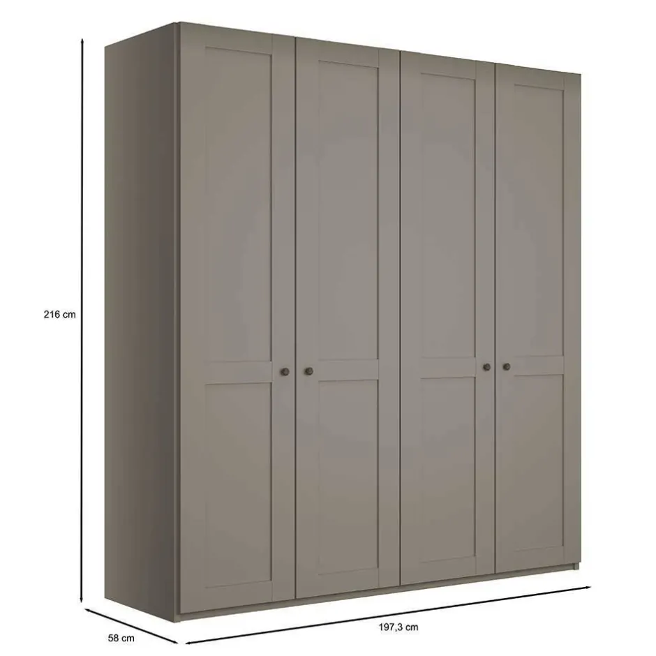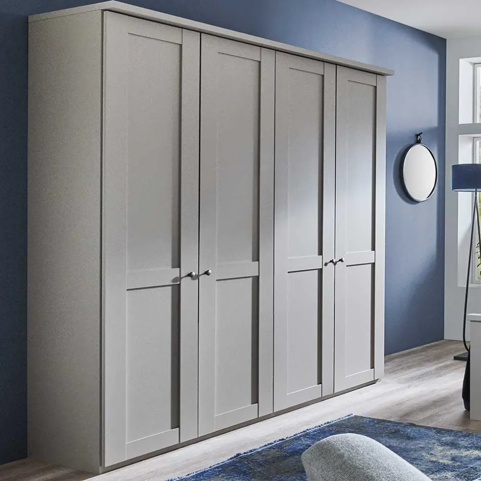 - Ein geräumiger 4-türiger Kleiderschrank bietet nicht nur ausreichend Stauraum, sondern auch ein Designhighlight dank der aufwändig gestalteten Kassettenfronten.