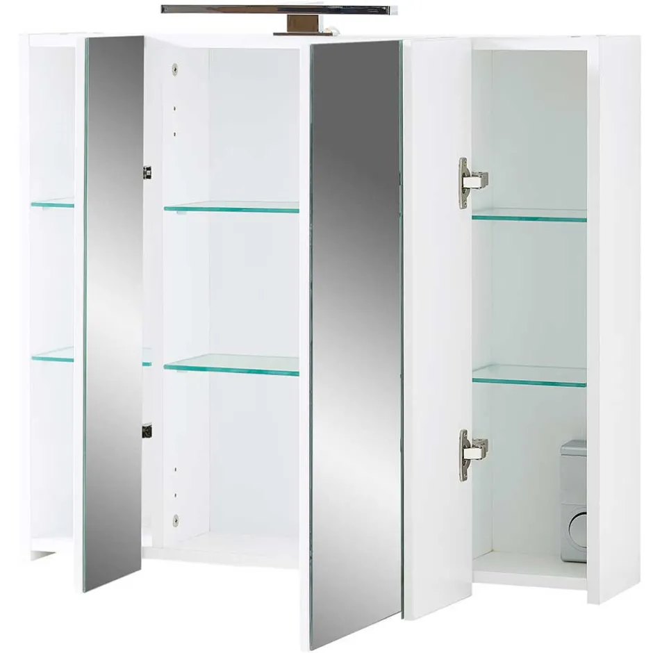 - Der Spiegelschrank (75,8×66,1×17,9 cm, ca. 21,18 kg): Drei Spiegeltüren bieten eine großzügige Spiegelfläche, während verstellbare Glasböden innen flexible Stauraummöglichkeiten schaffen. Besonders praktisch: Eine integrierte Schalter- und Steckdosenkombination für Rasierer oder elektrische Zahnbürsten.