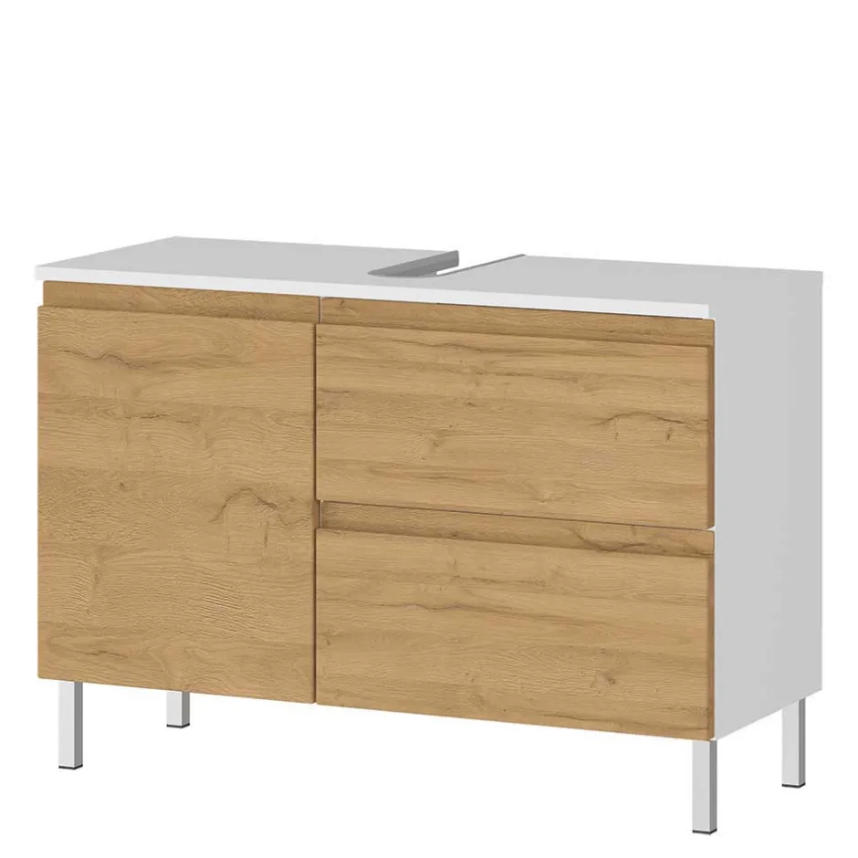 Die harmonische Kombination aus edler Wildeiche-Optik und strahlendem Weiß verleiht dem Badezimmer eine einladende und moderne Atmosphäre. Während die weiße Melaminbeschichtung für eine besonders pflegeleichte und widerstandsfähige Oberfläche sorgt, besticht die Holzoptik durch ihre natürliche Wärme. Die tiefgezogenen Kanten verstärken den hochwertigen Eindruck und unterstreichen die makellose Verarbeitung dieser stilvollen Badmöbel.