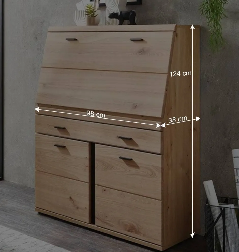 Mit einer Breite von 98 cm, einer Höhe von 124 cm und einer Tiefe von 38 cm bietet der Sekretär „Mattadore“ genügend Platz für Ihre Arbeitsutensilien und persönlichen Gegenstände. Eine praktische Schreibklappe mit Stützplattenauszug schafft eine komfortable Arbeitsfläche, während die durchdachte Inneneinteilung mit fünf Fächern für optimale Ordnung sorgt. Hinter zwei Türen mit Türdämpfung befinden sich Einlegeböden, die zusätzlichen Stauraum bieten. Eine Schublade mit Metallauszug, Soft Close und Selbsteinzug sorgt für besonderen Komfort und verhindert ungewolltes Zuschlagen.