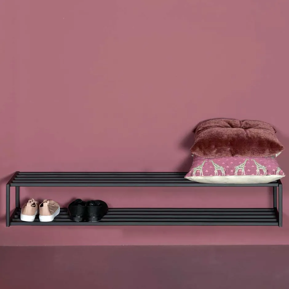 Die pulverbeschichtete Oberfläche in edlem Matt-Schwarz verleiht dem Regal eine zeitlose Eleganz und schützt gleichzeitig das Metall vor Kratzern und Korrosion. Diese hochwertige Veredelung sorgt dafür, dass das Schuhregal nicht nur gut aussieht, sondern auch im Alltag seine makellose Optik behält.