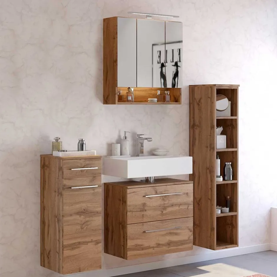 Höchste Qualität aus deutscher Produktion trifft auf zeitloses Design: Mit dem Badezimmermöbel-Set „Lemnas“ zieht kompromisslose Funktionalität und stilvolle Ästhetik in Ihre vier Wände ein. Diese exklusive vierteilige Kombination aus Regal, Spiegelschrank, Unterschrank und Unterbeckenschrank vereint modernes Design mit langlebiger Verarbeitung und intelligenten Stauraumlösungen – perfekt für alle, die ihr Bad nicht nur nutzen, sondern genießen wollen.