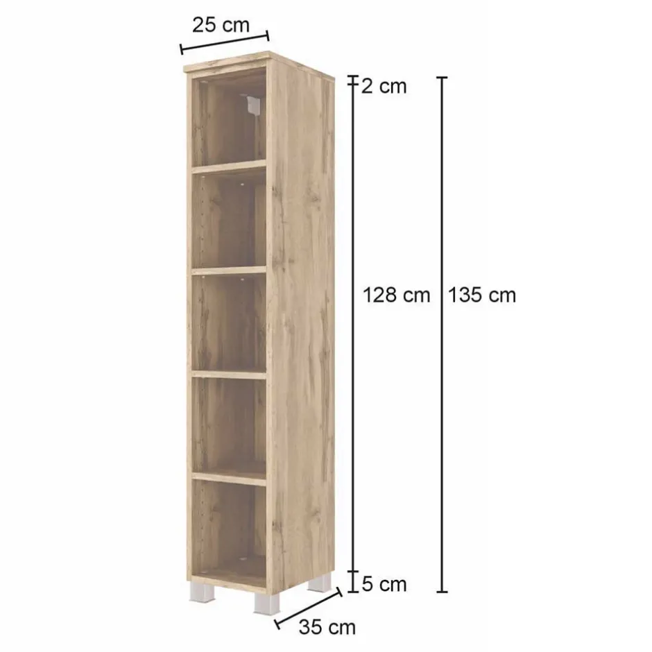 Das Regal mit den Maßen 25 x 130 x 35 cm bietet auf vier stabilen Einlegeböden viel Platz für Handtücher, Pflegeprodukte oder Deko. Offen gestaltet, setzt es Ihre Lieblingsstücke gekonnt in Szene und verleiht dem Raum eine luftige Atmosphäre.