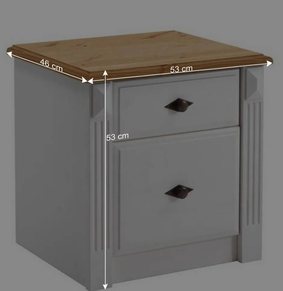 Ein echter Hingucker ist die laugenfarbig gebeizte und geölte Deckplatte – farblich harmonisch vom Korpus abgesetzt, setzt sie einen geschmackvollen Akzent und unterstreicht die edle Verarbeitung. Zwei großzügige Schubkästen mit praktischen Metallauszügen bieten reichlich Stauraum für alles, was Sie griffbereit neben dem Bett benötigen. Die formschönen Metallknöpfe runden das charmante Gesamtbild perfekt ab.