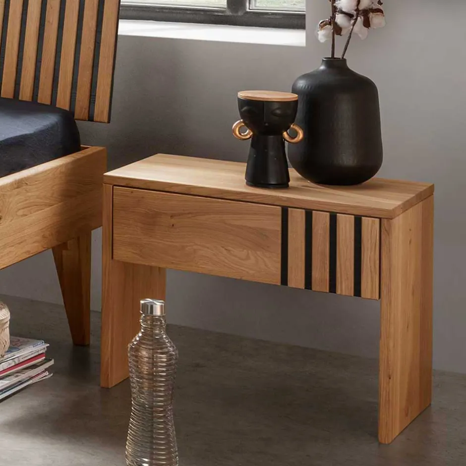 Unsere Nachtkommode „Manarola“ ist aus massivem Wildeichenholz gefertigt. Wildeiche ist nicht nur für ihre Robustheit und Langlebigkeit bekannt, sondern auch für ihre individuellen Merkmale. Wuchsrisse und Astlöcher zeugen von der Authentizität dieses Materials und geben jedem Möbelstück seinen einzigartigen Charakter. Sie sind natürliche Zeugen des Wachstums des Baumes und lassen sich nicht vermeiden.