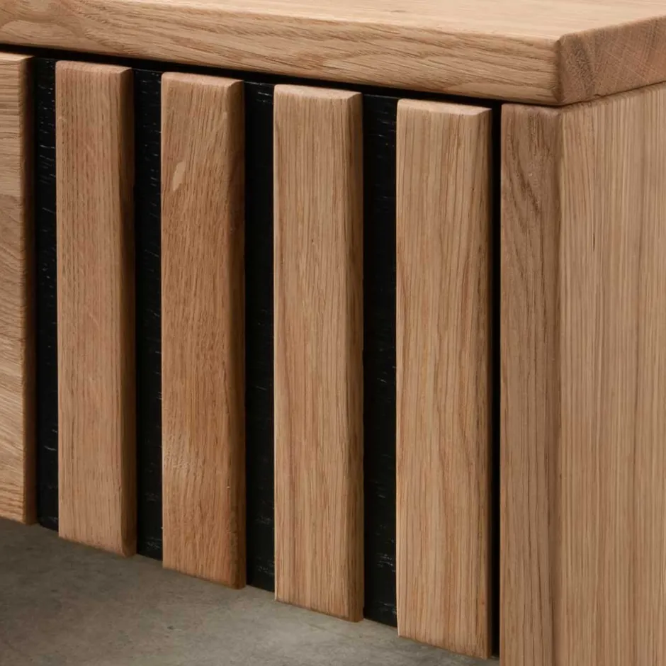 Die Oberfläche der Nachtkommode wurde natürlich geölt. Dieses Verfahren nicht nur schützt und pflegt das Holz, es hebt auch die wunderschöne, einzigartige Maserung des Wildeichenholzes hervor. Das Resultat ist eine samtige, warme Oberfläche, die zum Berühren einlädt.