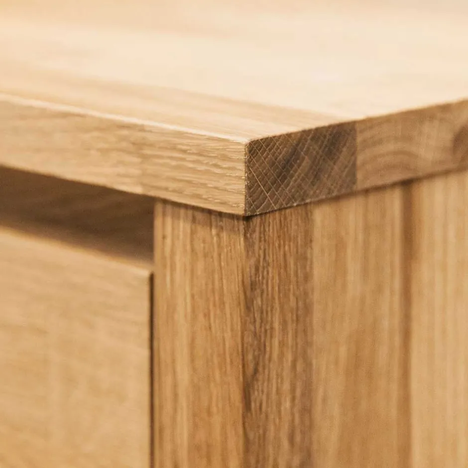 Jede Nachtkonsole ist einzigartig. Die natürlichen Öle, die zur Oberflächenbehandlung verwendet werden, betonen nicht nur die Maserung, sondern schützen das Holz auch und machen es widerstandsfähiger gegen tägliche Beanspruchungen. Farb- und Strukturdifferenzen zwischen den einzelnen Möbelstücken sorgen dafür, dass jedes Exemplar ein individuelles Kunstwerk ist.