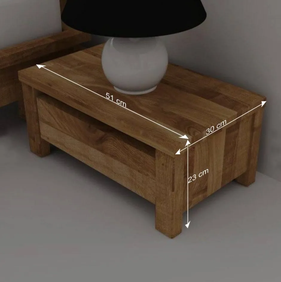 Erleben Sie die perfekte Symbiose aus rustikalem Charme und moderner Eleganz mit unserer Nachtkonsole „Nadalia“. Dieses exquisite Möbelstück bringt den warmen, natürlichen Charakter von massivem Wildeicheholz in Ihr Schlafzimmer. Wildeiche ist bekannt für seine Robustheit und Langlebigkeit und zeichnet sich durch eine lebendige, ausdrucksstarke Maserung aus. Die durchgehenden Lamellen, eine Konstruktion aus längs verbundenen Holzstücken, unterstreichen die Qualität und verleihen dem Möbelstück eine nahtlose, harmonische Optik.