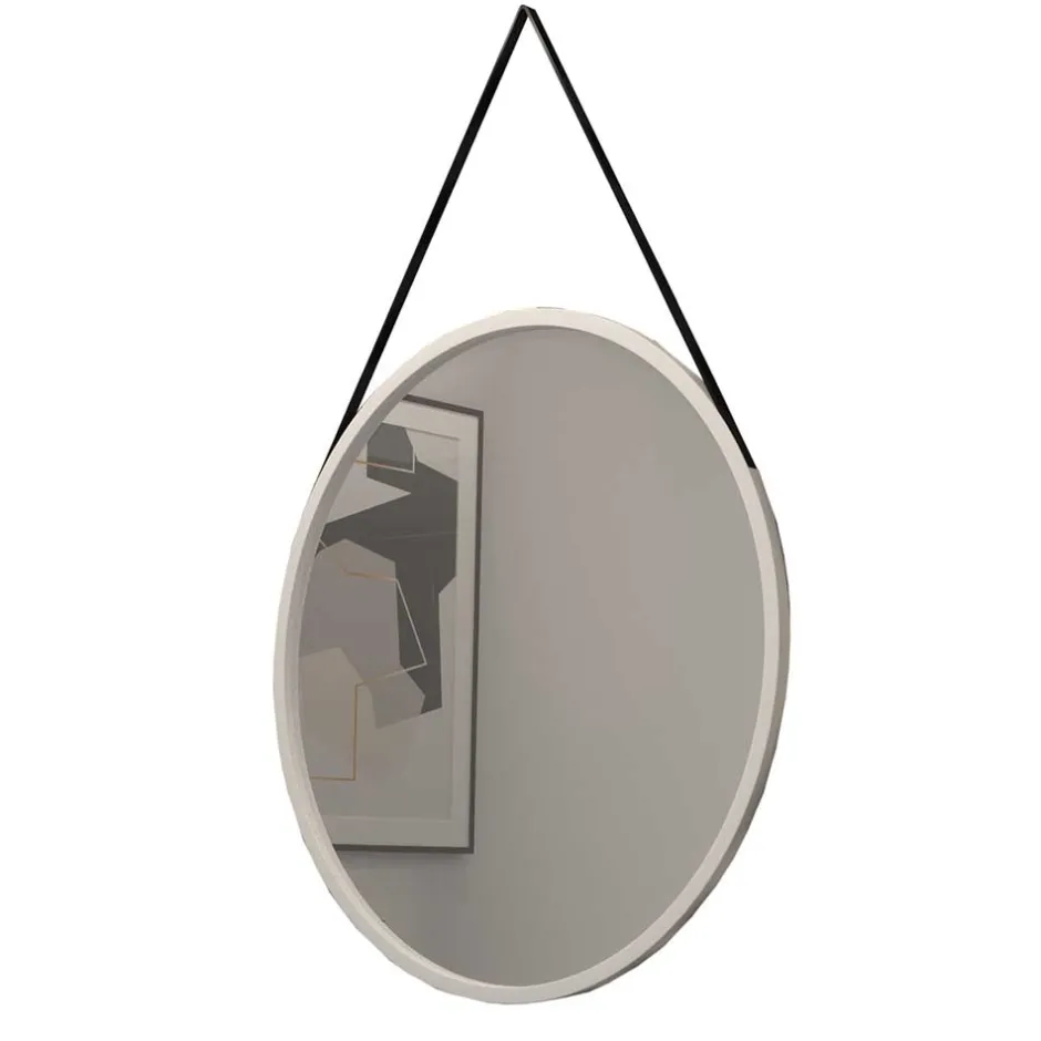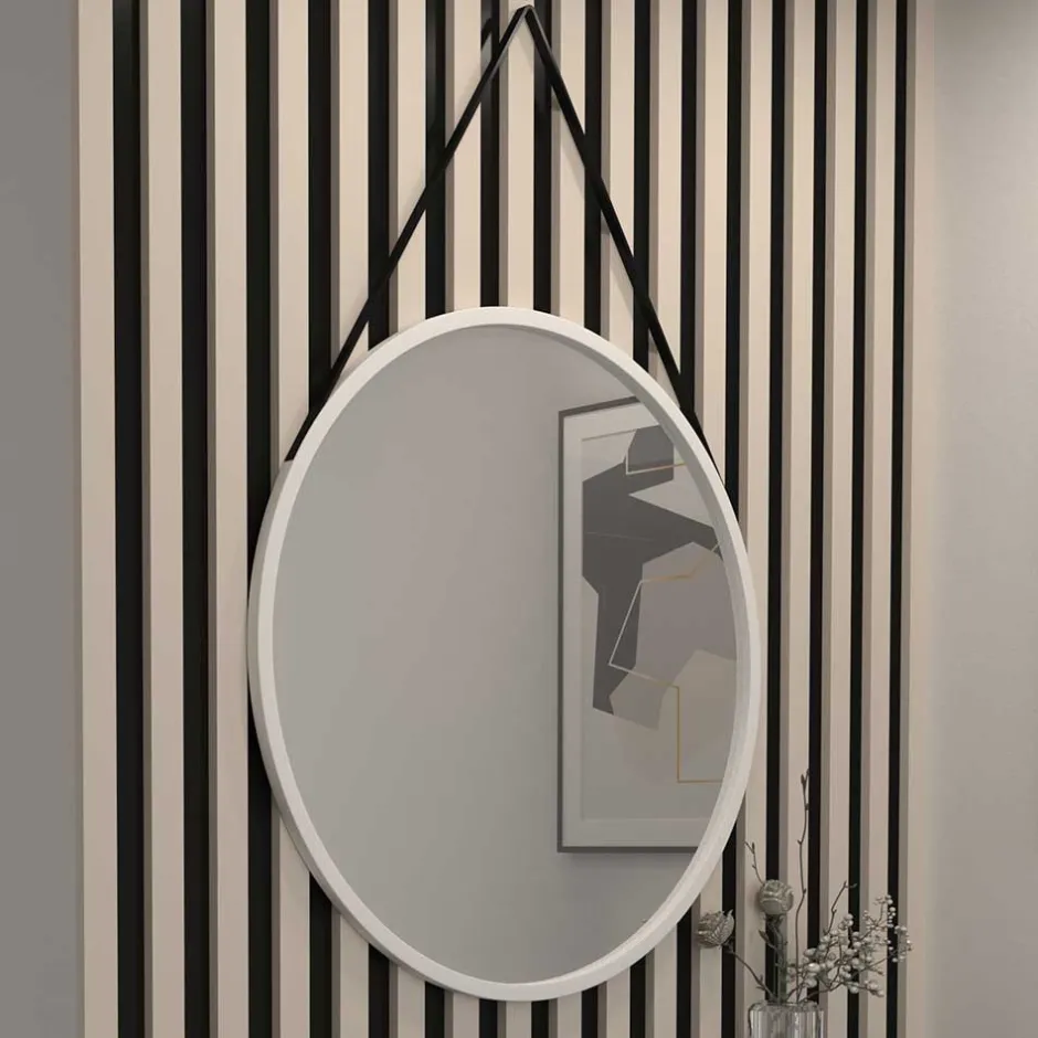 - Wandhängende Montage mit dekorativem Riemen aus schwarzem Kunstleder (100 % Polyurethan)