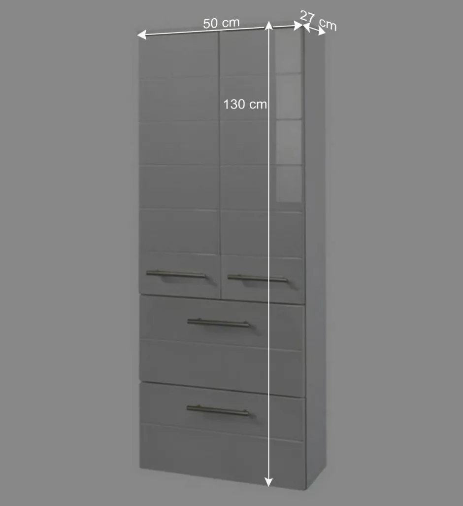 Mit einer Breite von 50 cm, einer Höhe von 130 cm und einer Tiefe von 27 cm nutzt Veverino den vorhandenen Raum maximal aus, ohne wuchtig zu wirken. Hinter zwei Drehtüren mit langlebigen Metallscharnieren verbergen sich zwei praktische Einlegeböden für Handtücher, Pflegeprodukte oder Reinigungsmittel. Zusätzlich bieten zwei leichtgängige Schubladen mit stabilen Metallauszügen weiteren Stauraum für kleinere Badutensilien. Der Türanschlag ist beidseitig montierbar und passt sich flexibel an Ihre Raumsituation an.