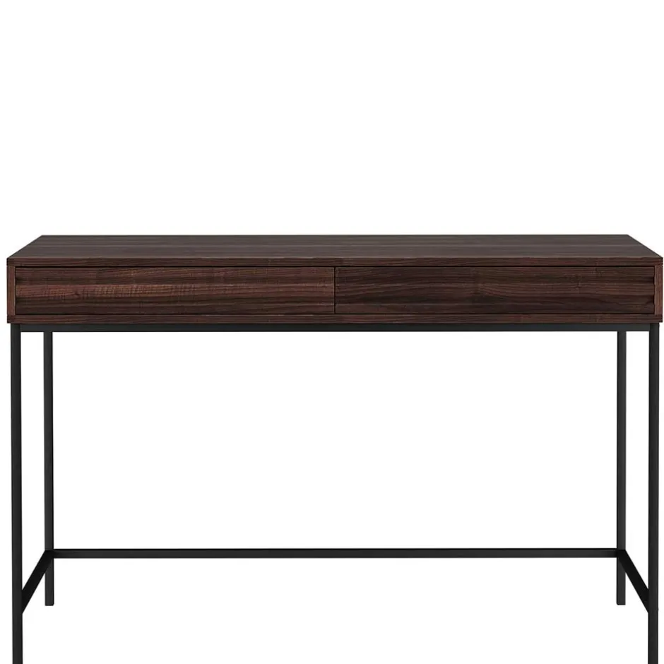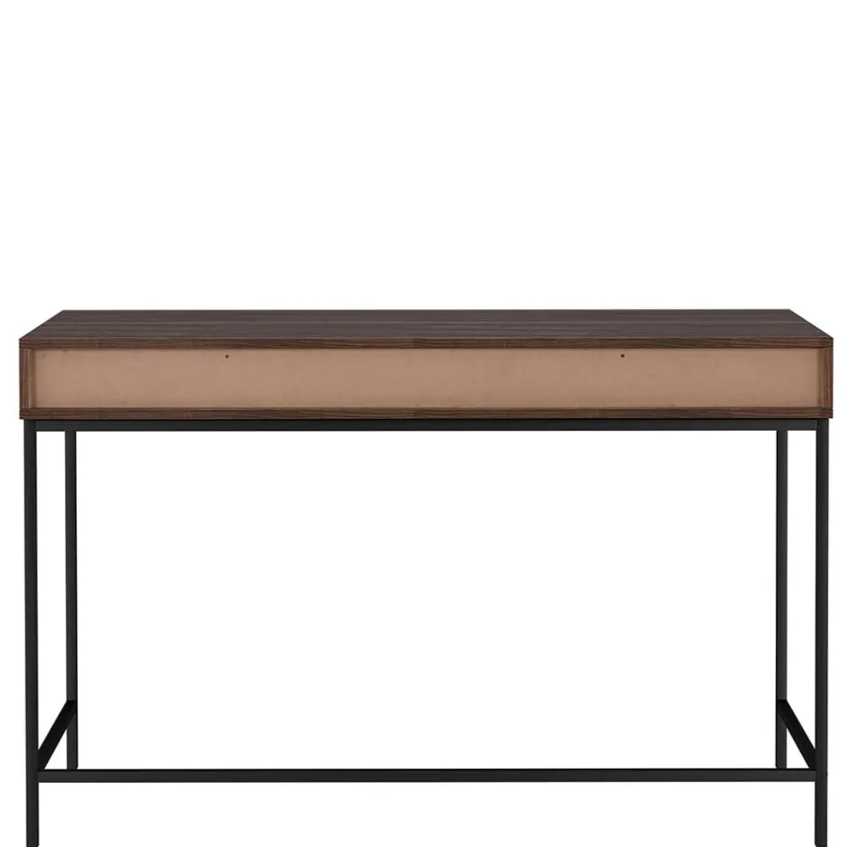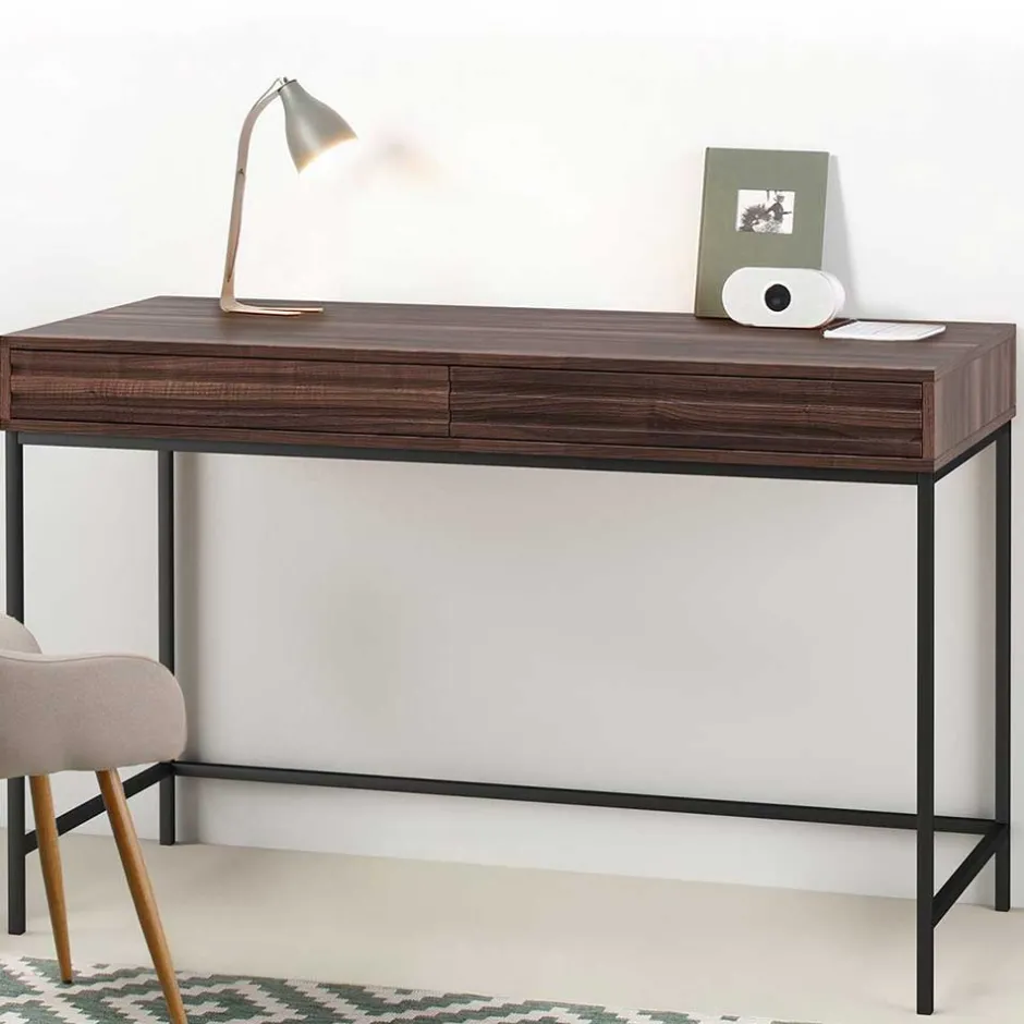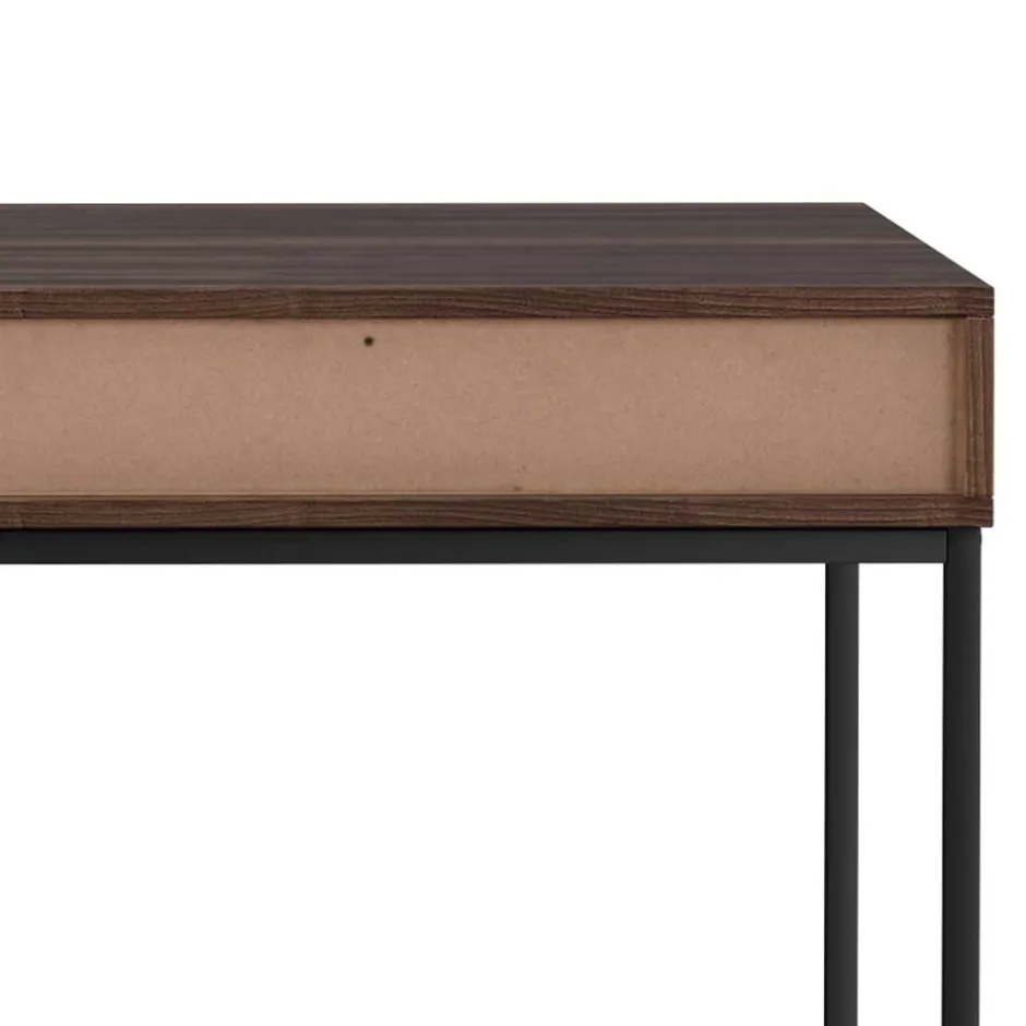 Gefertigt aus MDF und Spanplatte, besticht der Schreibtisch durch seine widerstandsfähige und pflegeleichte Oberfläche in Walnuss-Holzoptik. Das filigrane Vierfußgestell aus schwarzem Metall sorgt nicht nur für Stabilität, sondern unterstreicht zugleich den modernen Look des Möbelstücks. Die Schubladenfronten sind mit dekorativen horizontalen Rillen versehen, die dem Design eine stilvolle Dynamik verleihen.
