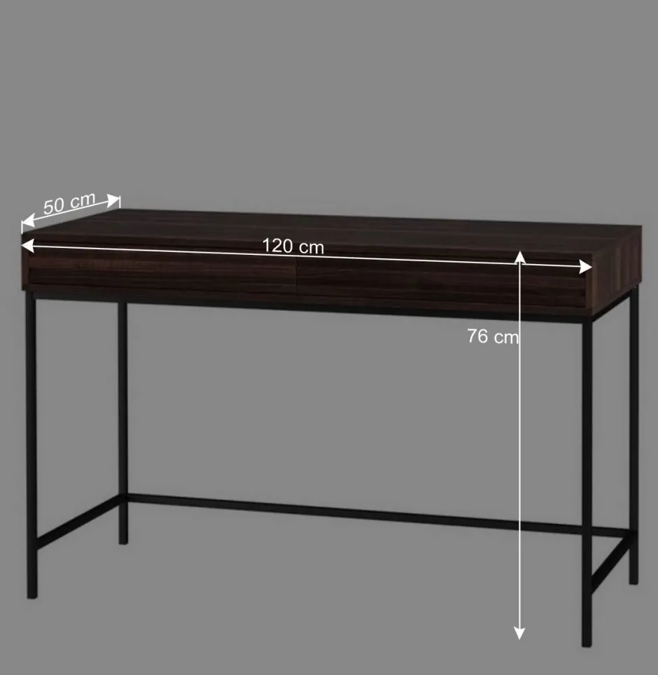 Mit einer Breite von 120 cm, einer Höhe von 76 cm und einer Tiefe von 50 cm bietet der Schreibtisch ausreichend Platz zum Arbeiten, ohne sperrig zu wirken. Dank seines schlanken Designs passt er optimal in kleinere Räume und lässt sich flexibel in verschiedene Wohn- und Arbeitsbereiche integrieren. Das Gewicht von ca. 24 kg sorgt für einen sicheren Stand.