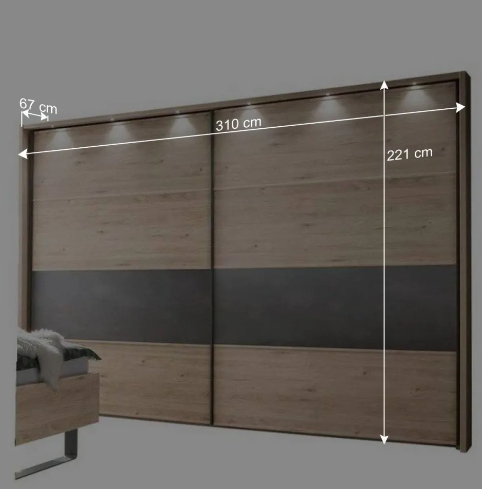 Der geräumige Schwebetürenschrank (310 x 221 x 67 cm) bietet mit seinen drei großzügigen Fachelementen jede Menge Platz für Kleidung, Accessoires und mehr. Die leichtgängigen Schwebetüren mit farblich abgestimmten Aufleistungen in Schiefer- und Eichefarben lassen sich dank der langen Griffleisten aus Metall mühelos öffnen. Hinter den Türen befinden sich drei Fachelemente, die jeweils mit zwei Einlegeböden und einer Kleiderstange ausgestattet sind – so bleibt alles stets ordentlich und übersichtlich. Der Passepartout-Rahmen mit sechs integrierten Leuchten setzt den Schrank besonders in Szene und verleiht ihm eine luxuriöse Ausstrahlung.