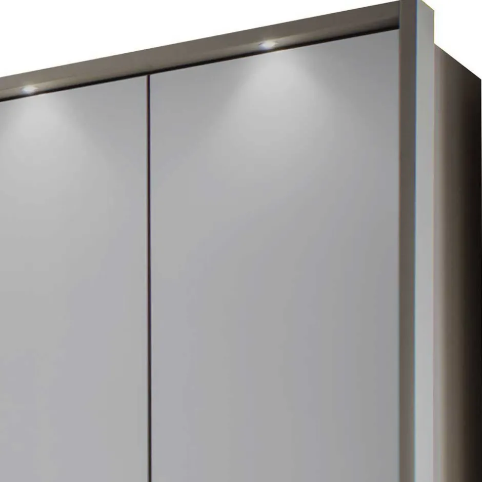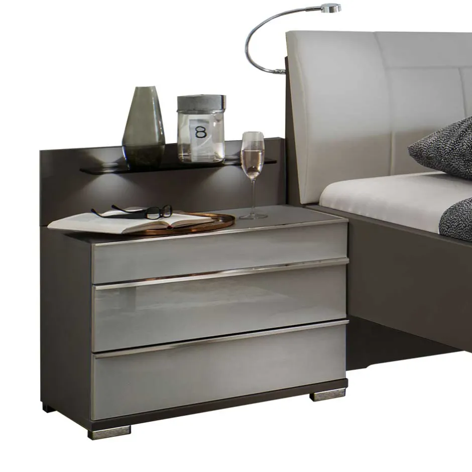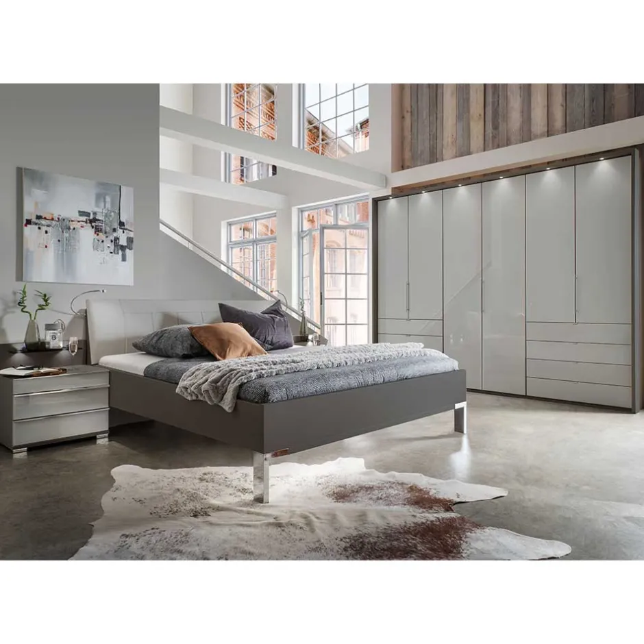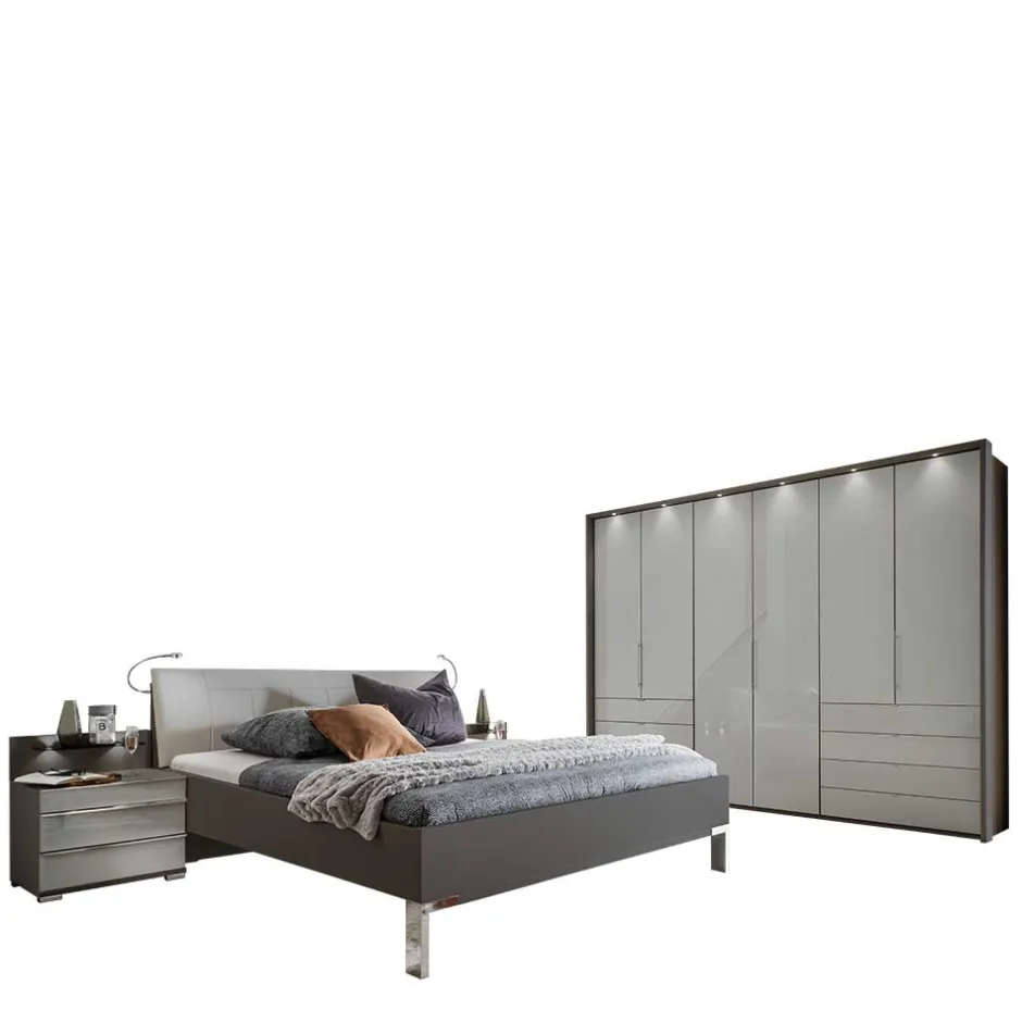 Mit seiner modernen Farbkombination und den fein folierten Korpusse in Braun, die nicht nur optisch ansprechend, sondern auch besonders pflegeleicht sind, setzt dieses Schlafzimmer-Set neue Maßstäbe. Die hellgrauen Glasfronten verleihen jedem Raum eine helle und luftige Atmosphäre, während das gepolsterte Kopfteil in hellgrauem Kunstleder zum Entspannen und Verweilen einlädt.