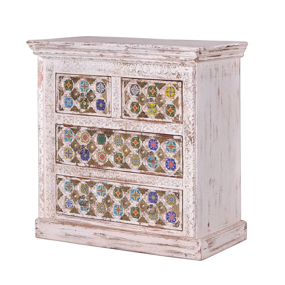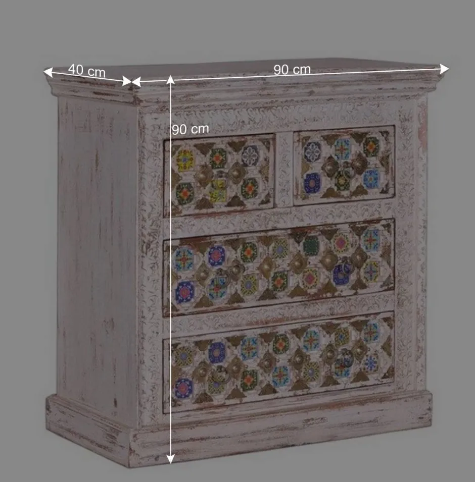 Die Shabby Chic Kommode „Mirell“ ist mehr als nur ein Möbelstück – sie ist ein Statement! Mit ihrer attraktiven Farbgebung in Antikweiß und bunten Akzenten bringt sie frischen Wind in Ihr Zuhause. Ideal platziert im Wohnzimmer, Schlafzimmer oder Flur, wird sie zum charmanten Mittelpunkt und bietet gleichzeitig praktischen Stauraum für Ihre Schätze. Jede Kommode wird in liebevoller Handarbeit aus hochwertigem Mangobaumholz gefertigt und ist damit ein wahres Unikat, das Charakter und Stil in Ihre Räume bringt.
