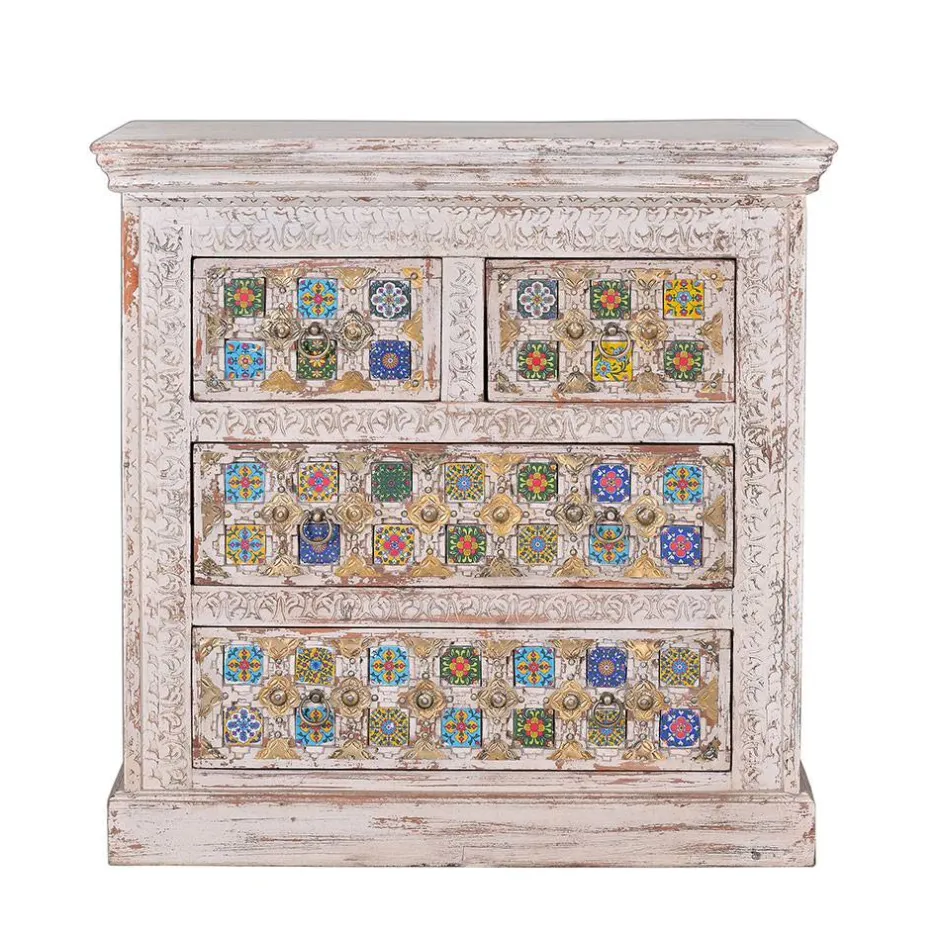 Die „Mirell“ ist aus massivem Mangobaumholz gefertigt, das für seine Robustheit und natürliche Schönheit bekannt ist. Die Holzoberflächen sind mit einem White Wash Effekt behandelt, der die einzigartigen Maserungen des Holzes hervorhebt. Um das nostalgische Design perfekt abzurunden, sind die Kommode und die Schubladenfronten mit bunten Keramikfliesen dekoriert, die wunderschöne florale Ornamente zeigen. Die bronzefarbigen Ringgriffe und Beschläge aus Metall verleihen der Kommode einen eleganten Akzent, während die gefrästen Kanten der Deckplatte und des Sockels die exquisite Verarbeitung unterstreichen.