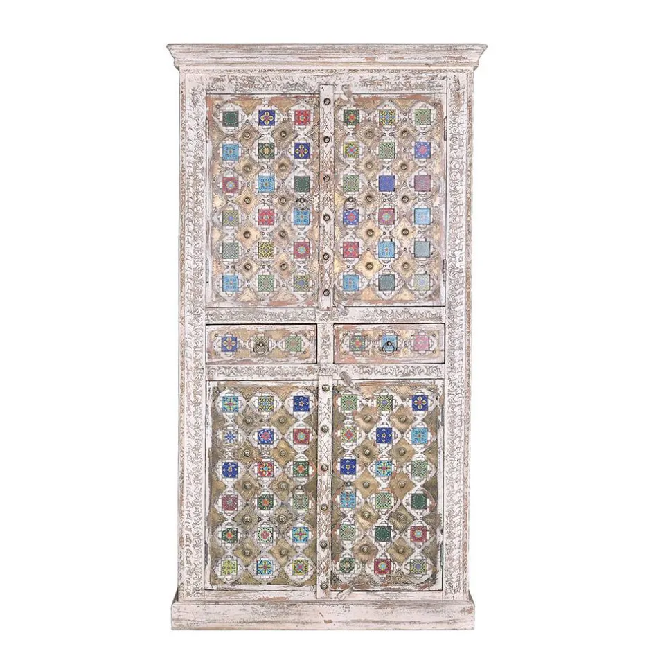 Der Wohnzimmerschrank „Mirell“ überzeugt auf den ersten Blick mit seinem unverwechselbaren Shabby Chic-Stil. In einem charmanten Antikweiß mit farbenfrohen Akzenten gehalten, strahlt er nostalgisches Flair und stilvolle Leichtigkeit aus. Die kunstvoll gestaltete Front mit bunten Mini-Keramikfliesen, die florale Muster zeigen, macht den Schrank zu einem echten Blickfang. Mit seiner Höhe von 185 cm und einer Breite von 100 cm bietet „Mirell“ eine großzügige und stilvolle Möglichkeit, Ordnung ins Wohnzimmer zu bringen.