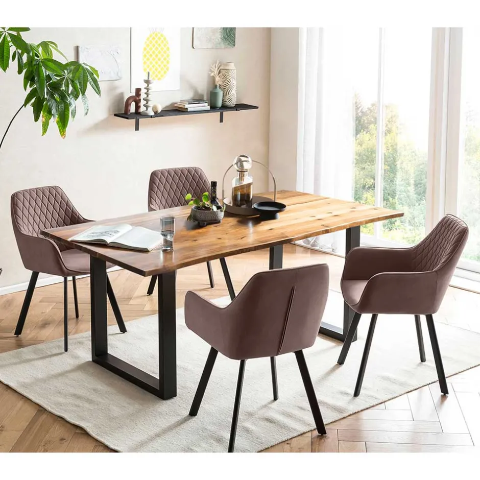 Massives Akazienholz bildet das Fundament der Tischplatte – ein Material, das nicht nur für seine außergewöhnliche Härte bekannt ist, sondern auch für seine ausdrucksstarke Maserung. Die cognacfarbene Oberfläche wird in einem aufwendigen Lackierverfahren veredelt, bei dem mehrere Schichten aufgetragen und sorgfältig gehärtet werden. So entsteht ein satter, gleichmäßiger Farbton mit seidenmattem Glanz und hohem Schutz gegen Alltagseinflüsse.