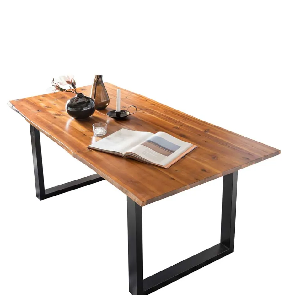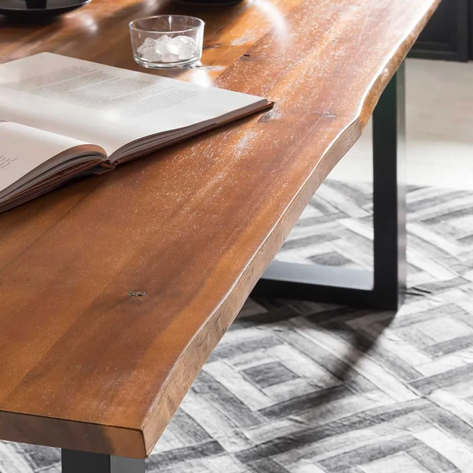 Besonders ins Auge fällt die organisch gewachsene Baumkante, die direkt aus dem Stamm geschnitten wurde. Diese Kante verleiht jedem Tisch seine ganz eigene, naturbelassene Form – unverfälscht, einzigartig und lebendig. Im Zusammenspiel mit dem dunklen Metallgestell entsteht ein spannender Kontrast aus Natur und Industrie – ein Ausdruck von Charakter und Stil.