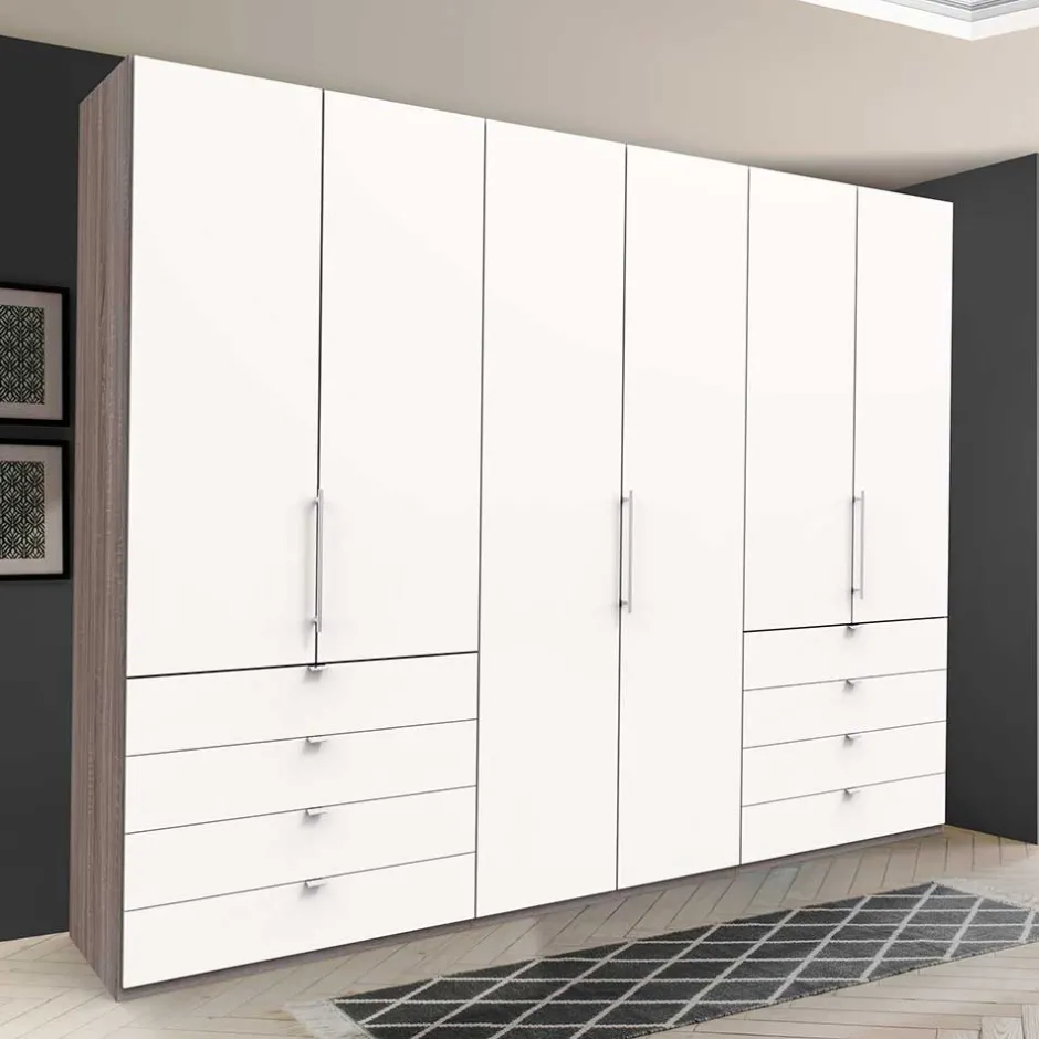 Drei Panorama-Falttüren im Sechs-Türen-Look lassen sich platzsparend nach vorn ziehen und bieten damit einen großzügigen Einblick in den Innenraum. Hinter diesen Türen verbergen sich drei Facheinheiten mit jeweils zwei Einlegeböden und einer Kleiderstange aus Metall, ideal für das organisierte Verstauen von Kleidung. Für kleinere Gegenstände stehen acht Schubladen mit einer Breite von jeweils 100 cm zur Verfügung. Besonders hervorzuheben ist dabei der Metallauszug mit Soft Close und Selbsteinzug. Dieses System sorgt für ein sanftes, geräuschloses Schließen der Schubladen und erhöht zudem den Bedienkomfort.
