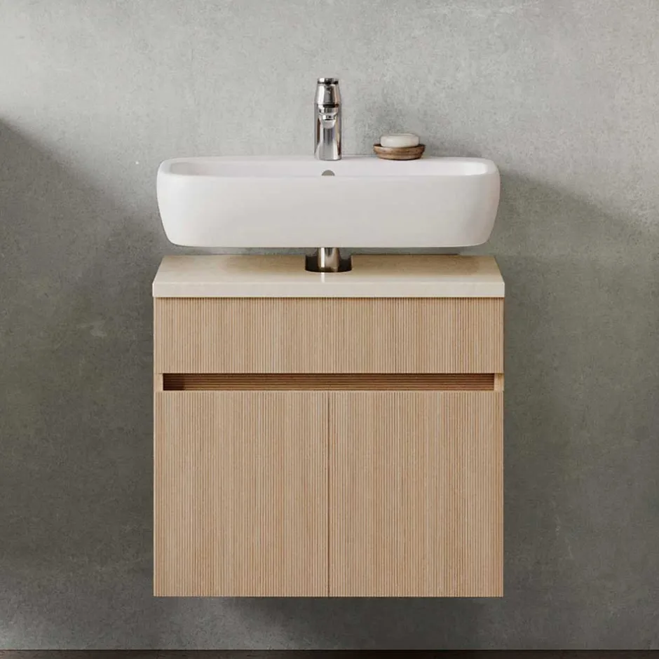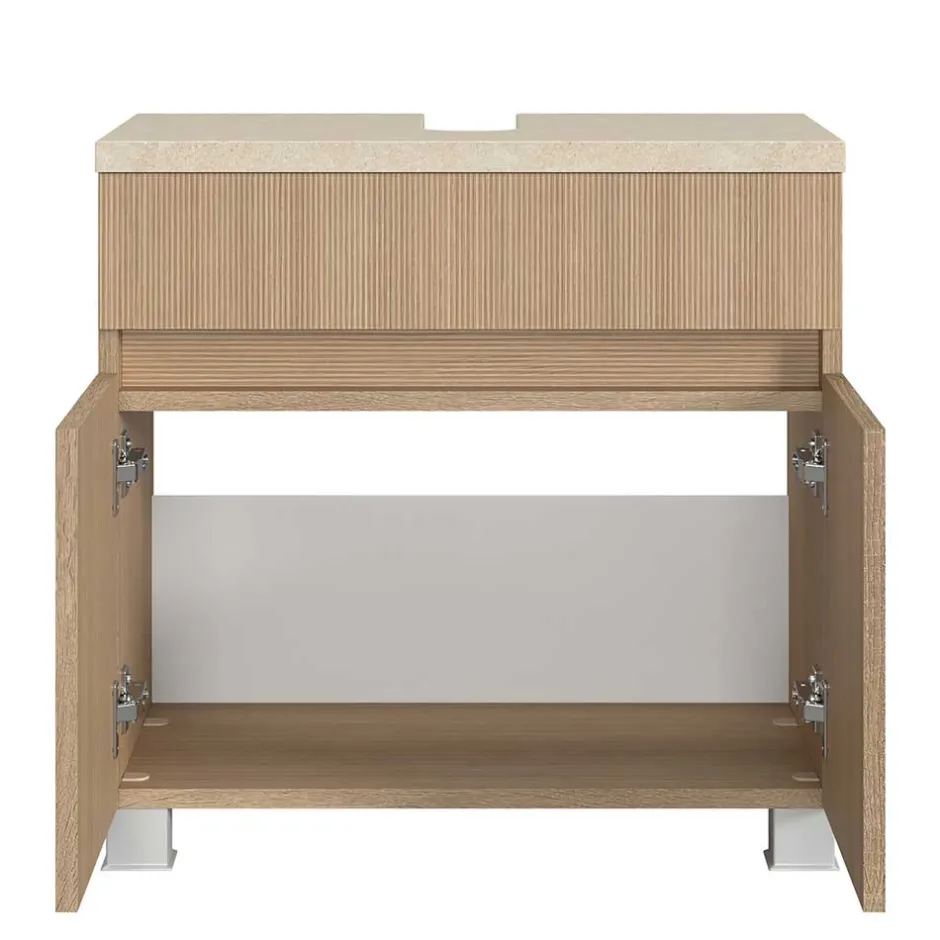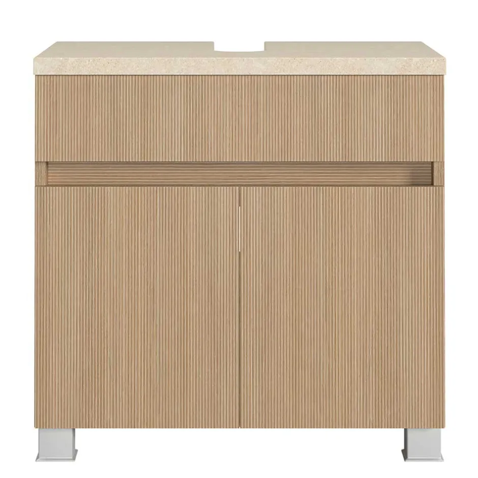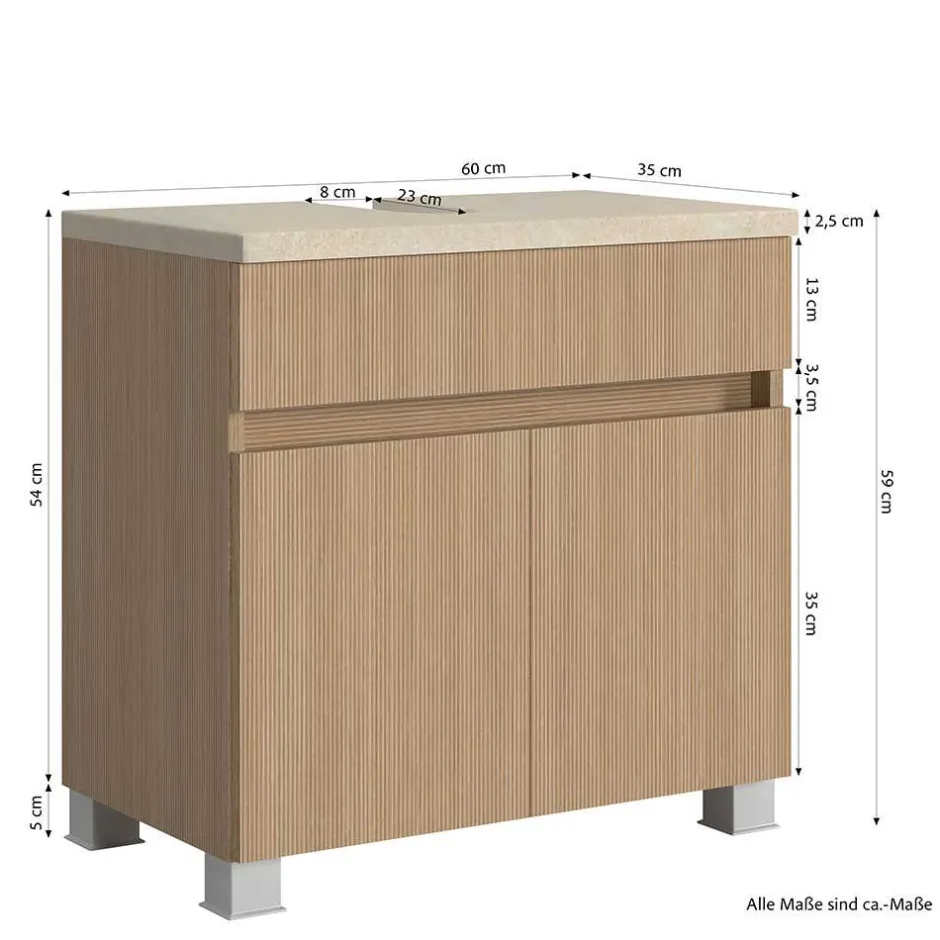 Schaffen Sie mehr Ordnung in Ihrem Badezimmer mit dem Unterbeckenschrank „Vibulam“. Die warme Eichenholz-Optik sorgt für ein natürliches Ambiente, während die Deckplatte in beiger Sandstein-Optik eine harmonische und stilvolle Ergänzung darstellt. Perfekt als Ergänzung für Ihr Waschbecken, bietet dieser Unterschrank genügend Platz für Pflegeprodukte, Putzutensilien und vieles mehr. Hergestellt in Deutschland, punktet „Vibulam“ mit hoher Qualität und durchdachtem Design.