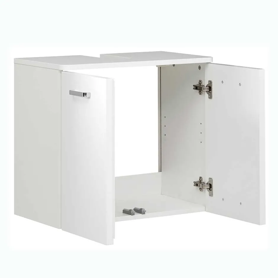 Der Waschbeckenschrank „Yennja“ überzeugt mit einer praktischen Doppeltür, die mit hochwertigen Metallbeschlägen und einer Soft-Close-Funktion ausgestattet ist. So schließen die Türen sanft und geräuschlos. Der großzügige Innenraum hinter den Türen bietet viel Platz für Ihre Badutensilien, während die offene Rückwand eine unkomplizierte Installation der Wasserleitungen ermöglicht. Darüber hinaus wurde in der Deckplatte bereits ein Ausschnitt für den Siphon eingearbeitet – eine durchdachte Lösung für den schnellen Aufbau. Der Schrank lässt sich sowohl hängend als auch stehend aufstellen. Bei der stehenden Variante kommen vier Füße in glänzender Chrom-Optik zum Einsatz, die dem Möbelstück zusätzlich Stabilität verleihen.