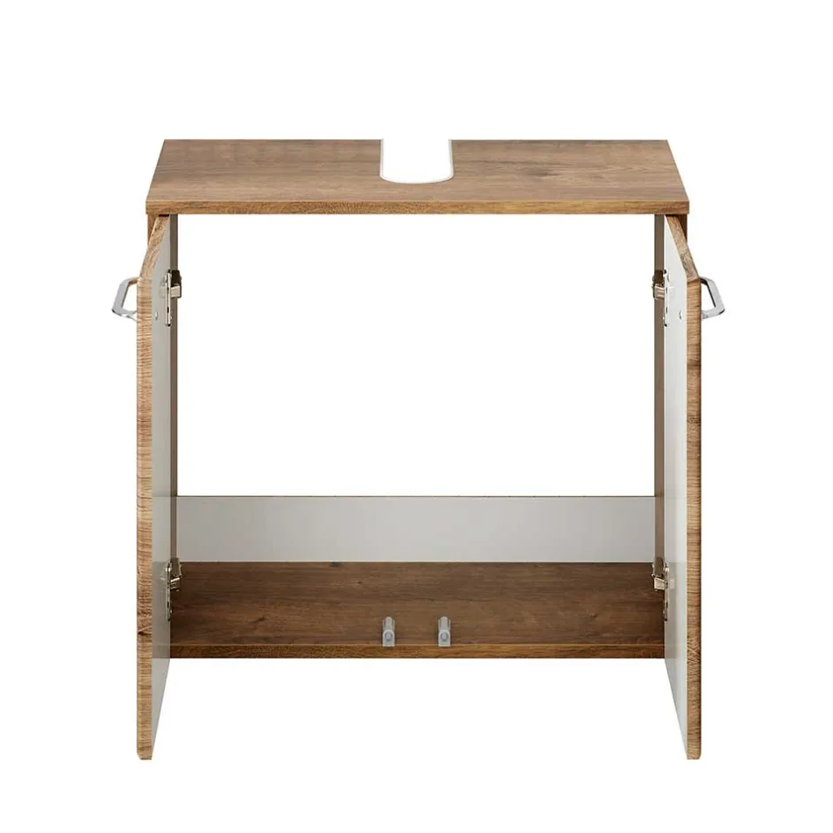 Der Waschbeckenunterschrank besteht aus robustem Holzwerkstoff, wobei die Materialstärke des Korpus 16 mm beträgt. Die pflegeleichten Oberflächen sind mit einer Melaminharzbeschichtung versehen, die nicht nur strapazierfähig und kratzfest ist, sondern auch das zeitlose Design unterstreicht. Mit stoßfesten ABS-Kanten und stilvollen Bügelgriffen aus glänzendem Chrom bietet dieser Unterschrank sowohl Sicherheit als auch eine moderne Optik.