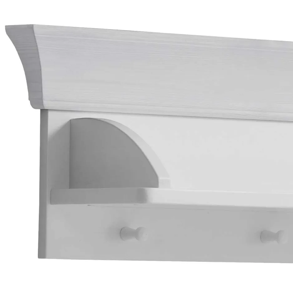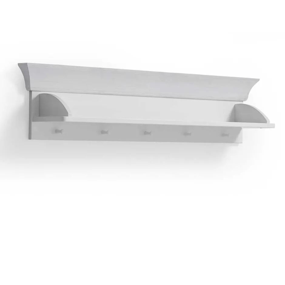 Mit einer Breite von 107 cm, einer Höhe von 26 cm und einer Tiefe von 21 cm ist das Regal kompakt, aber ausgesprochen funktional. Die seitlich begrenzte Ablage eignet sich hervorragend zum Abstellen von Kuscheltieren, Bilderbüchern oder kleinen Deko-Elementen. Besonders praktisch sind die fünf Haken in Knopfform – ideal zum Aufhängen von Rucksäcken, Jacken oder Turnbeuteln. Die maximale Belastbarkeit von 20 kg sorgt dabei für ausreichend Spielraum im Alltag.