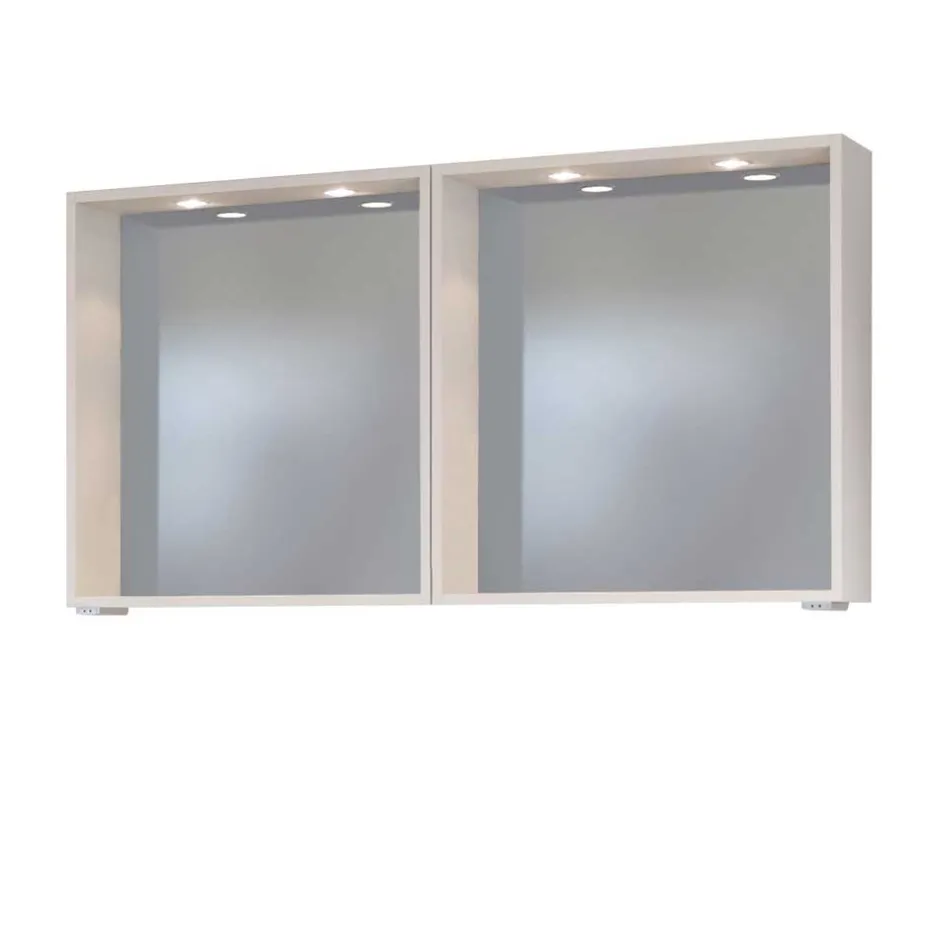 Das dreiteilige Set besteht aus zwei eleganten Spiegelpaneelen (je 60x64x18 cm) und einem großzügig dimensionierten Unterbeckenschrank (120x41x47 cm). Die Spiegelpaneele verfügen über eine schmale Ablagefläche für tägliche Badutensilien sowie zwei moderne Touch-LED-Einbauleuchten, die für eine stimmungsvolle, energieeffiziente Beleuchtung sorgen. Der weiße Rahmen unterstreicht das klare Design.