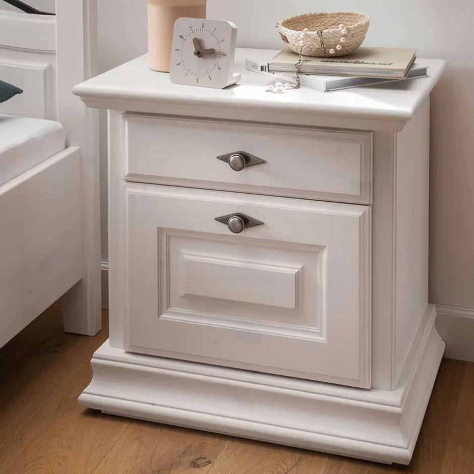 Die Nachtkommode „Beato“ verfügt über zwei geräumige Schubladen mit Metall-Vollauszug, die viel Stauraum für Ihre Utensilien bieten. Die handlichen Metall-Knopfgriffe erleichtern das Öffnen und Schließen der Schubladen, während das formschöne Sockelgestell und die dekorativ gefräste Deckplatte den charmanten Landhausstil unterstreichen.