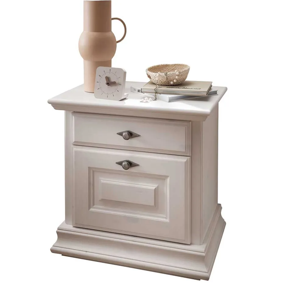 Entdecken Sie die Nachtkommode „Beato“ im angesagten Landhausstil, exklusiv bei Wohnen.de! Dieses hochwertige Möbelstück zeichnet sich durch seine erstklassige Material- und Verarbeitungsqualität aus, die für eine lange Lebensdauer sorgt. Hergestellt aus massivem Kiefernholz und weiß gewachst, überzeugt „Beato“ durch seine durchscheinende Holzmaserung und sorgt für eine gemütliche Atmosphäre in Ihrem Schlafzimmer.