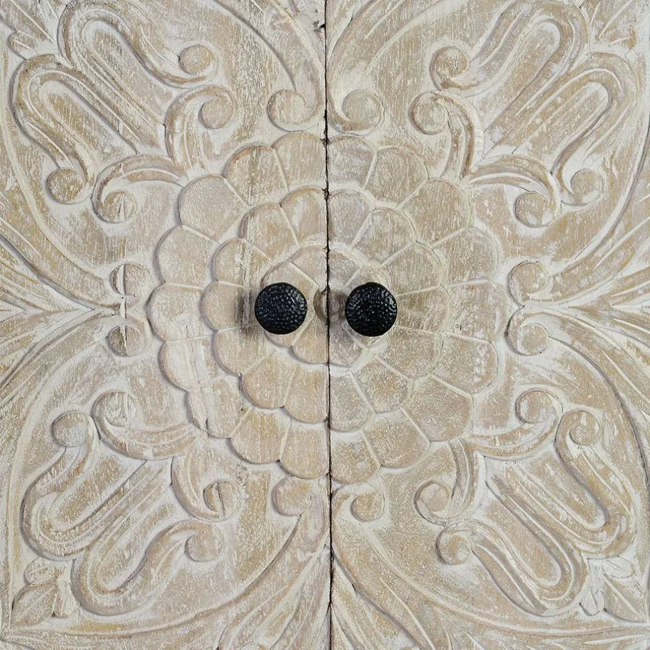 Das White Wash Sideboard „Bonany“ vereint rustikalen Charme mit kunstvoller Handwerkskunst und wird so zum absoluten Blickfang in jedem Wohnraum. Das antikweiße Finish verleiht dem Möbelstück eine nostalgische Note, während das schwarze Metallgestell einen stilvollen Kontrast setzt. Die kunstvoll geschnitzten Mandala-Motive auf den Fronten sorgen für eine unverwechselbare Optik und machen jedes Exemplar zu einem Unikat. Ob im Wohnzimmer, Essbereich oder Flur – dieses Sideboard verleiht Ihrem Zuhause eine besondere Atmosphäre.