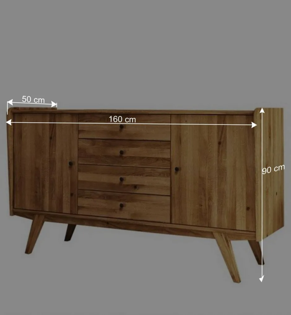Mit einer Breite von 160 cm, einer Höhe von 90 cm und einer Tiefe von 50 cm bietet das Sideboard „Hardus“ jede Menge Stauraum und wird zum Blickfang in jedem Raum. Die Stärke der Seiten, Front und Deckplatte beträgt je ca. 2 cm, was zusätzliche Robustheit verleiht. Die nach vorne dezent abgerundeten Kanten, der überstehende Rand und die dekorativ vorspringenden Seiten runden die Optik harmonisch ab und verleihen dem Möbelstück eine elegante und zugleich markante Note.
