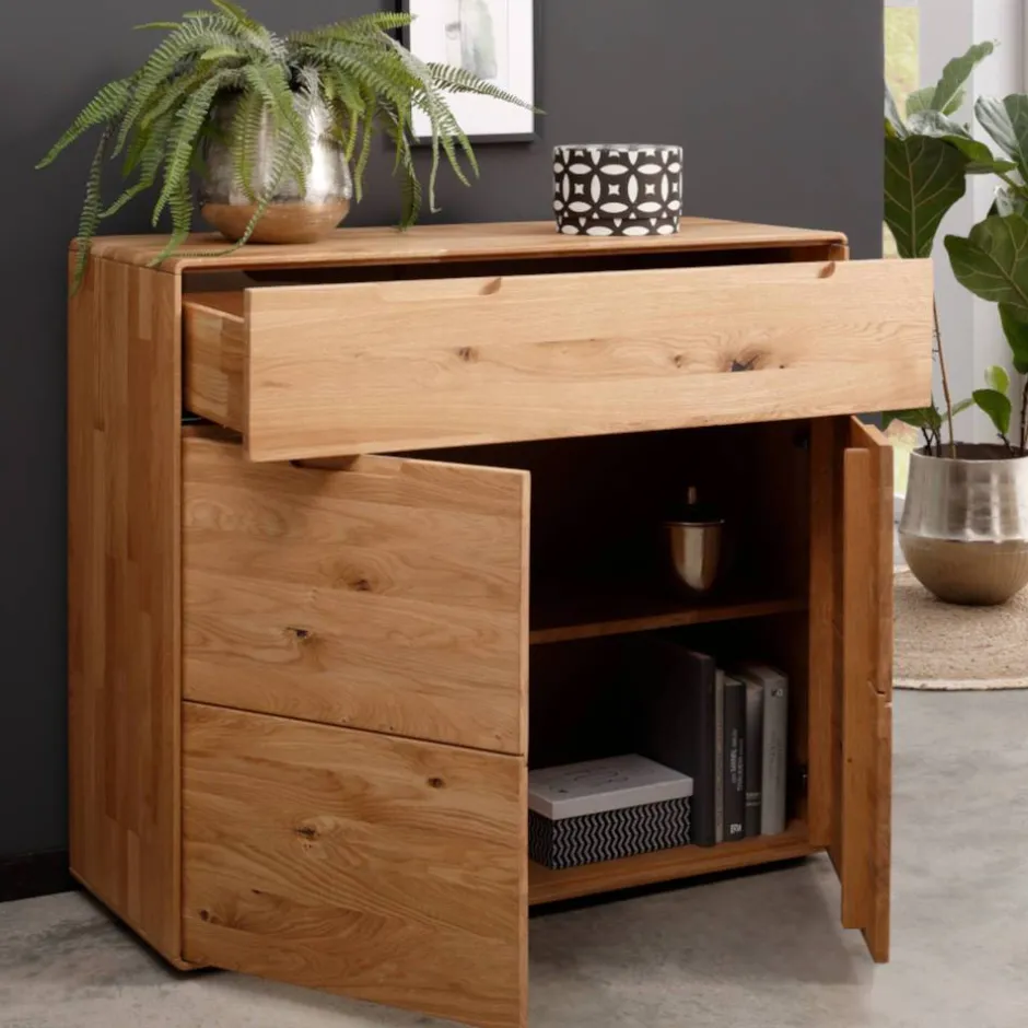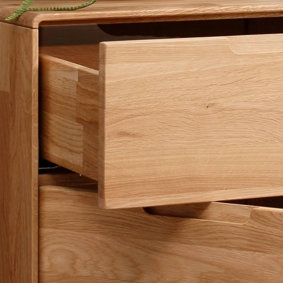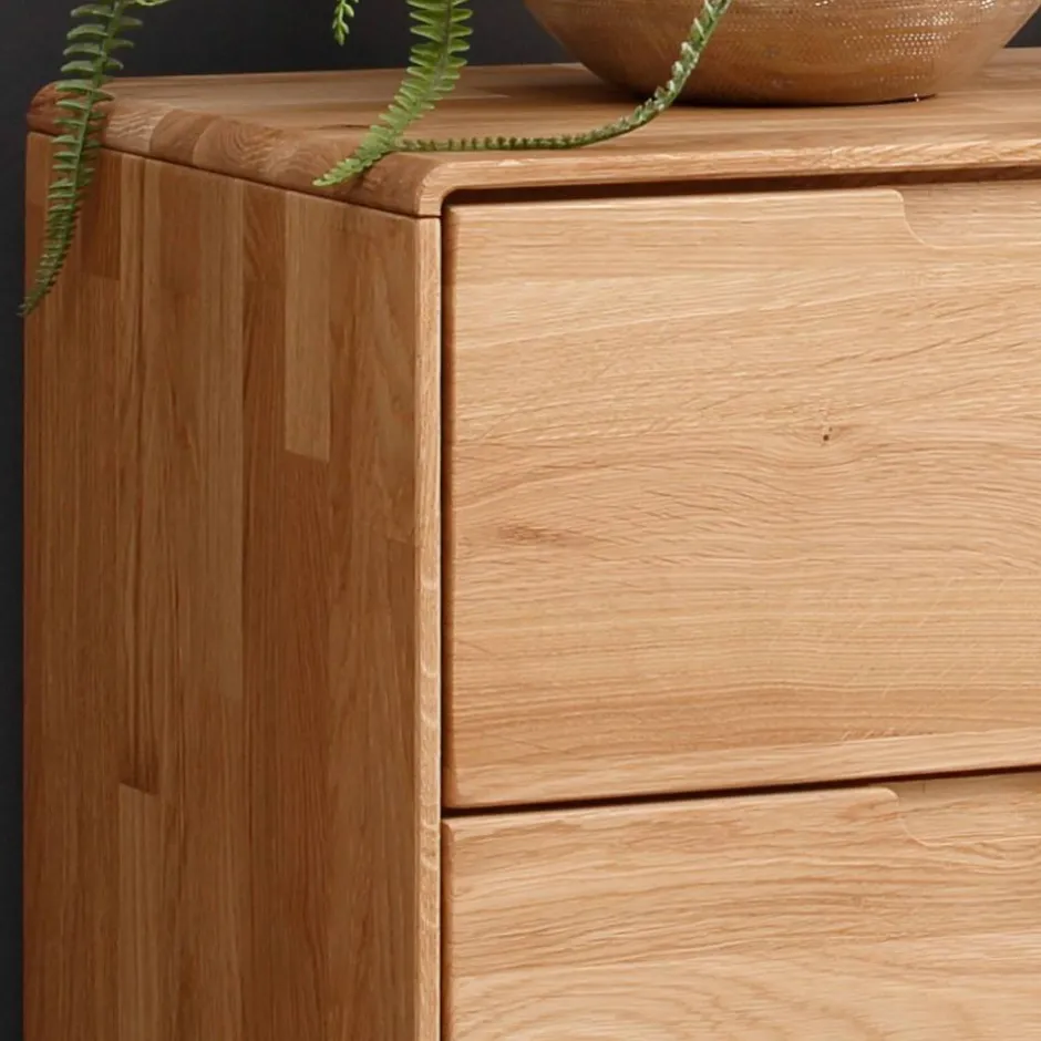 Die massiven Wildeiche-Elemente der Kommode tragen aktiv zu einem gesunden Raumklima bei. Holz reguliert auf natürliche Weise die Luftfeuchtigkeit, was zu einer angenehmen Wohnatmosphäre beiträgt. Die sorgfältig abgerundeten Kanten zeugen von exzellenter Verarbeitung und sorgen nicht nur für eine elegante Optik, sondern auch für Sicherheit in Ihrem Zuhause.