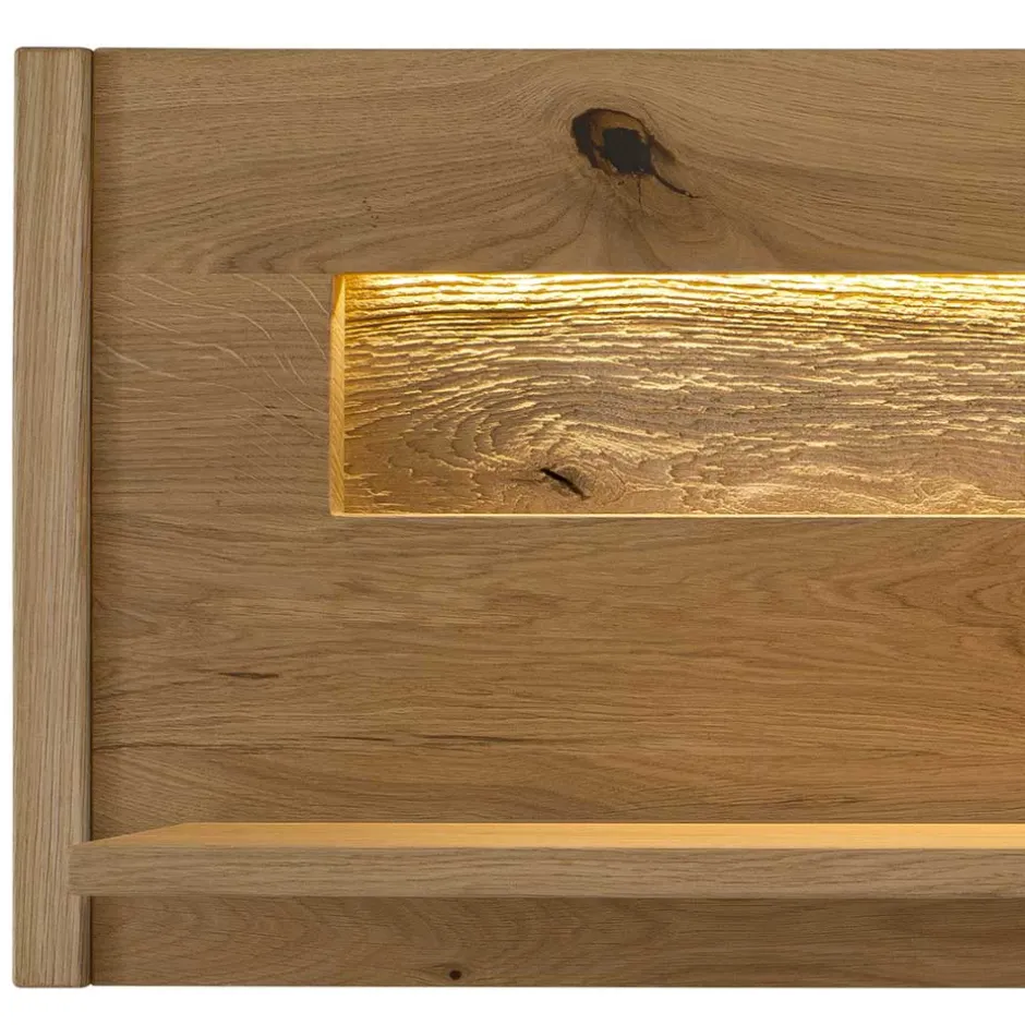 Der raffinierte Rückwand-Ausschnitt des Wandboards ist mit sandgestrahltem Holz in lebhafter Struktur abgesetzt und verleiht dem Board eine besondere Note. Sie haben außerdem die Möglichkeit, diesen Ausschnitt mit energiesparender LED-Beleuchtung zu bestellen, um noch mehr Atmosphäre in Ihr Zuhause zu bringen.