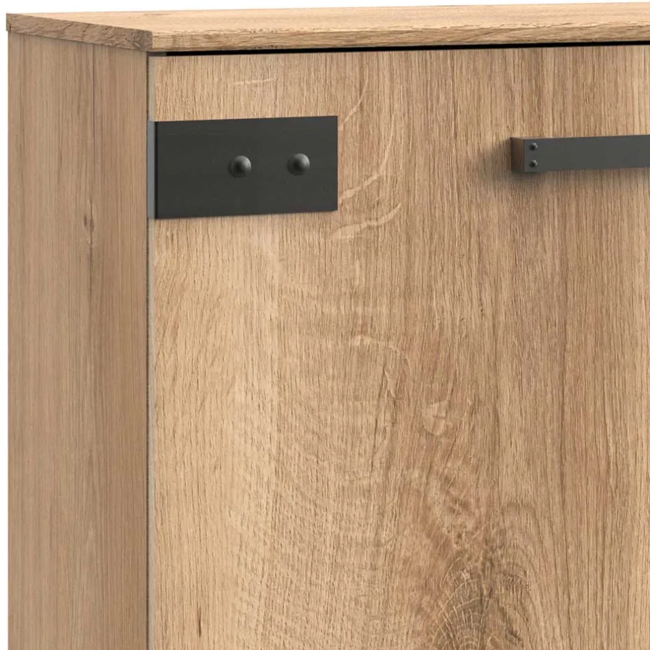 Ergänzt wird das Design durch schwarze, schlichte Bügelgriffe aus Kunststoff und flache Kunststoff-Füße, die für einen stabilen Stand sorgen. Diese Elemente unterstreichen die industrielle Ästhetik und ergänzen die funktionale Eleganz der Kommode.