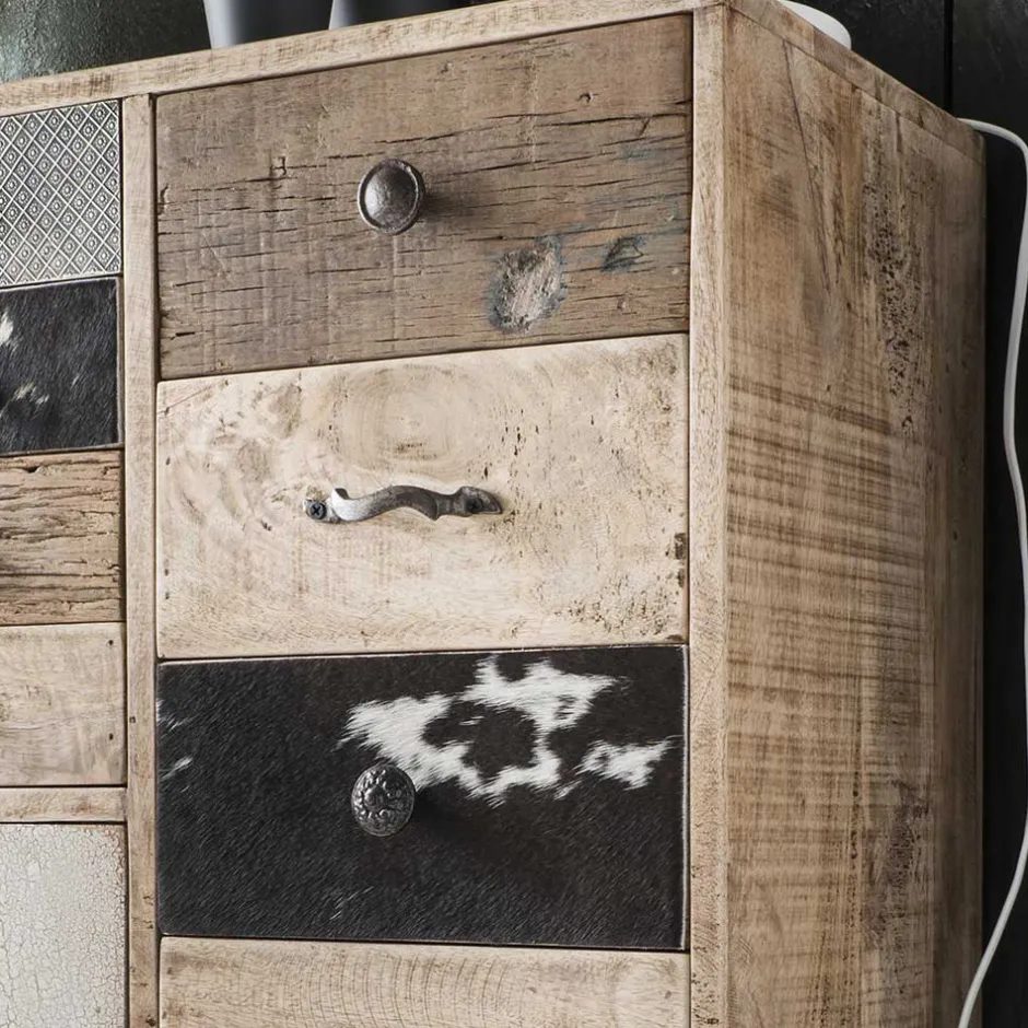 Die Hochkommode „Conville“ wird aus massivem recyceltem Mangobaumholz hergestellt. Dieses Holz zeichnet sich durch seine natürliche Unregelmäßigkeit in Struktur und Farbschattierungen aus, was jedes Möbelstück zu einem einzigartigen Unikat macht. Der Mangobaum ist nicht nur nachhaltig, sondern auch von Natur aus robust und langlebig.