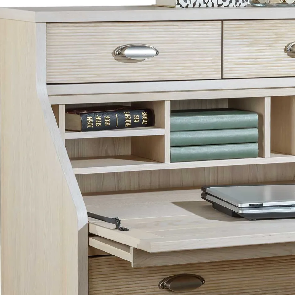- Schreibklappte mit Metallbeschlägen und automatischem Stützplattenauszug, intelligente Einteilung mit sieben Fächern