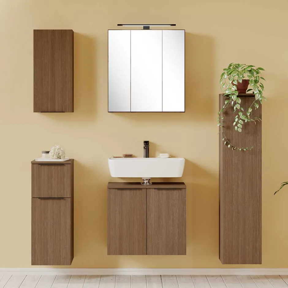 Ein Badezimmer gewinnt mit dem Badmöbel-Set „Ucaida“ sofort an Klasse und Komfort. Spiegelschrank mit LED-Beleuchtung, Midischrank, Oberschrank, Unterschrank und Waschbeckenschrank bilden zusammen ein harmonisches Gesamtpaket, das Funktionalität und Ästhetik perfekt vereint. In dunkler Eiche gestaltet, strahlt dieses Ensemble Wärme und zeitlose Eleganz aus. Jedes einzelne Teil wurde in Deutschland gefertigt und steht für Qualität und Verlässlichkeit. Durch die abgestimmte Zusammenstellung verwandelt sich selbst ein kleines Bad in einen großzügig wirkenden Raum mit durchdachter Organisation und einem Hauch von Luxus.